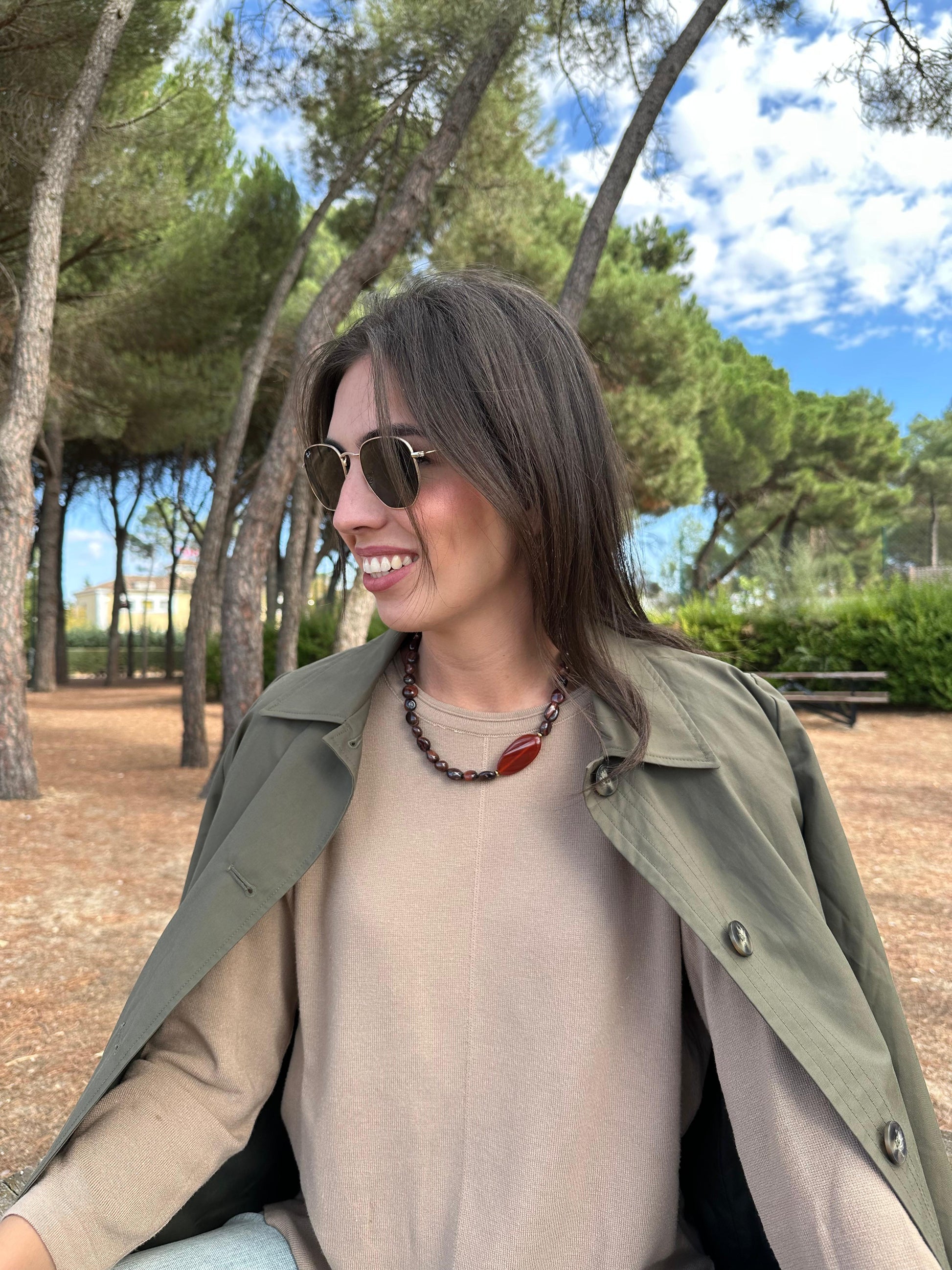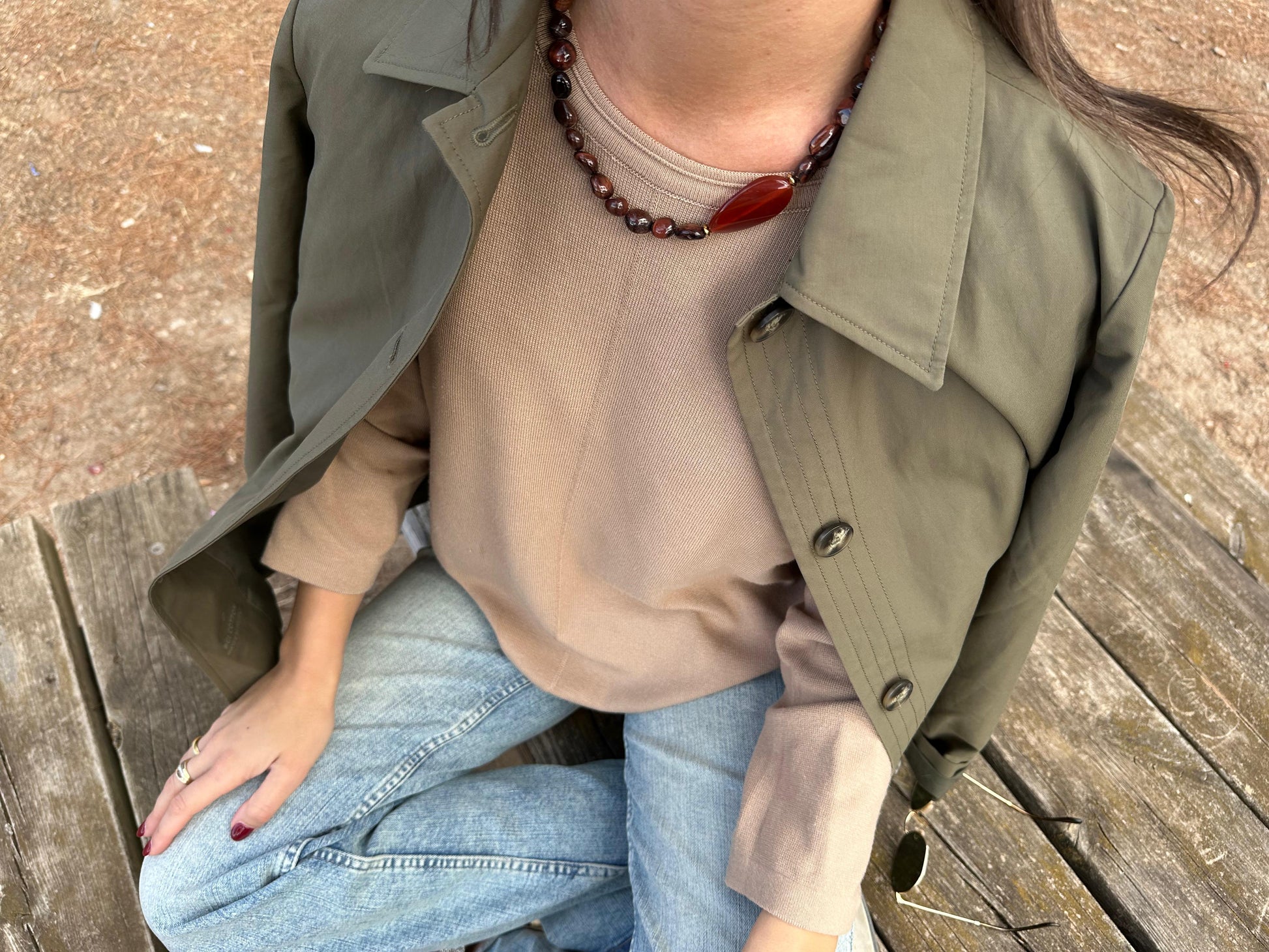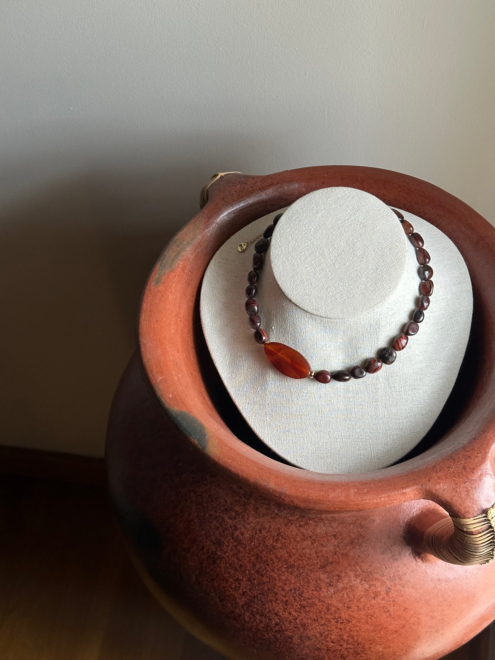 Colllar de 41cm de largo hecho en piedra natural de ojo de buey con una piedra en el lateral al tono de Ágata