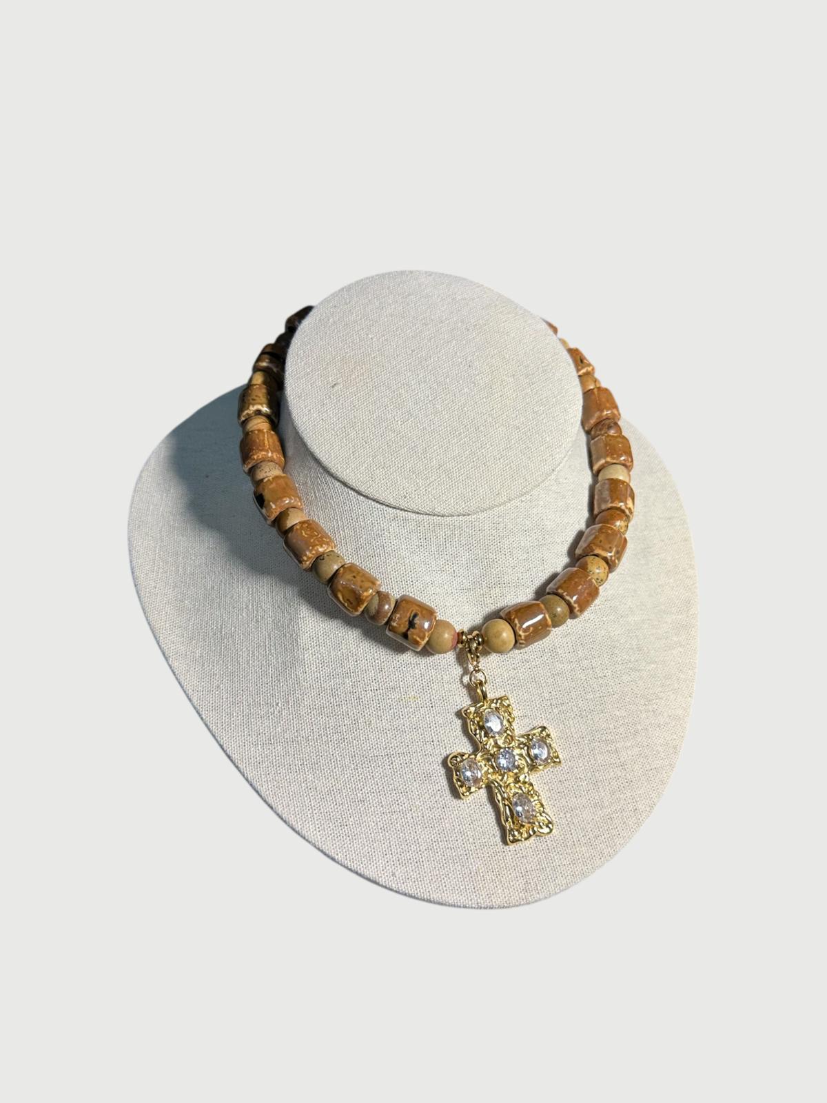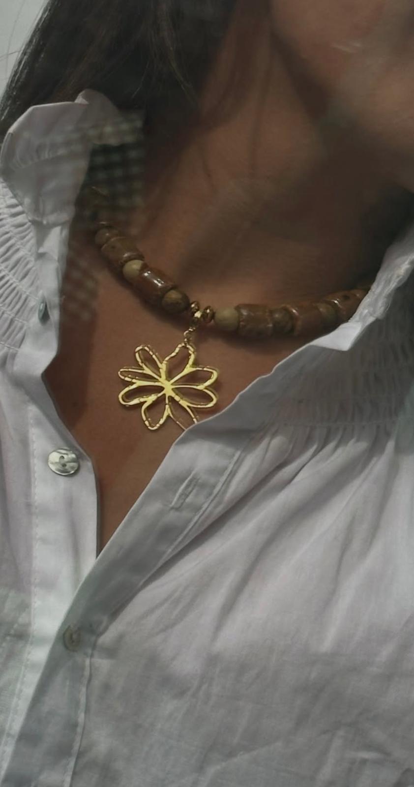 Collar de piezas de madera y piezas de cerámica en tonos marrones. Mide 38cm y tiene 5cm más de cadena extensible.