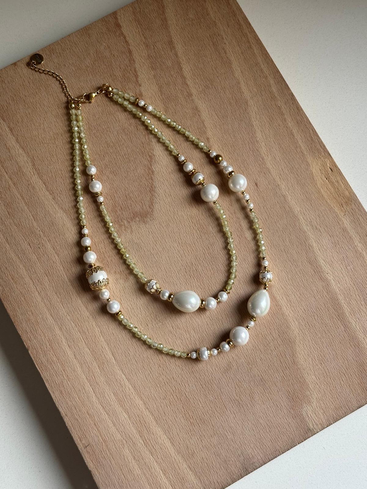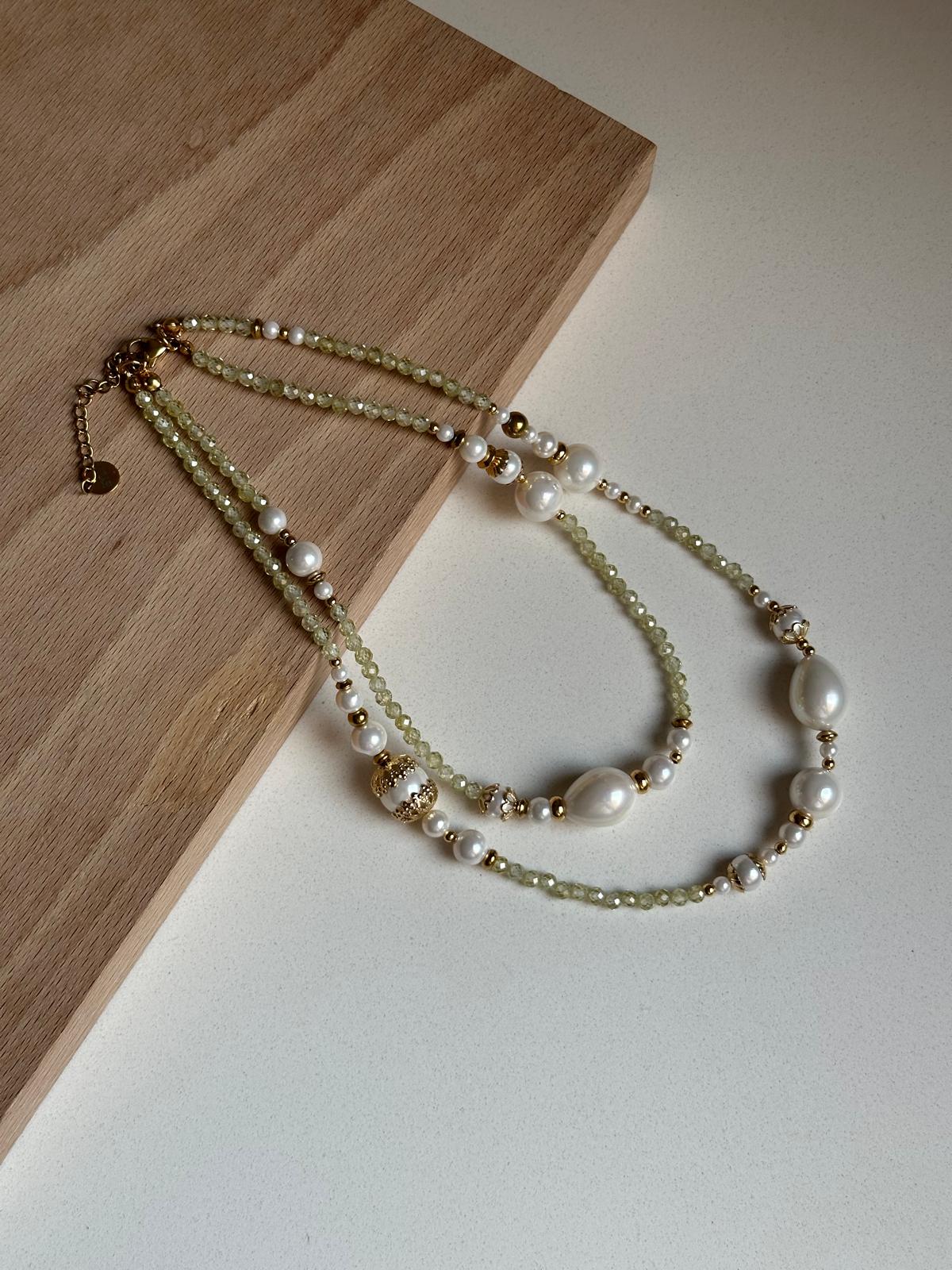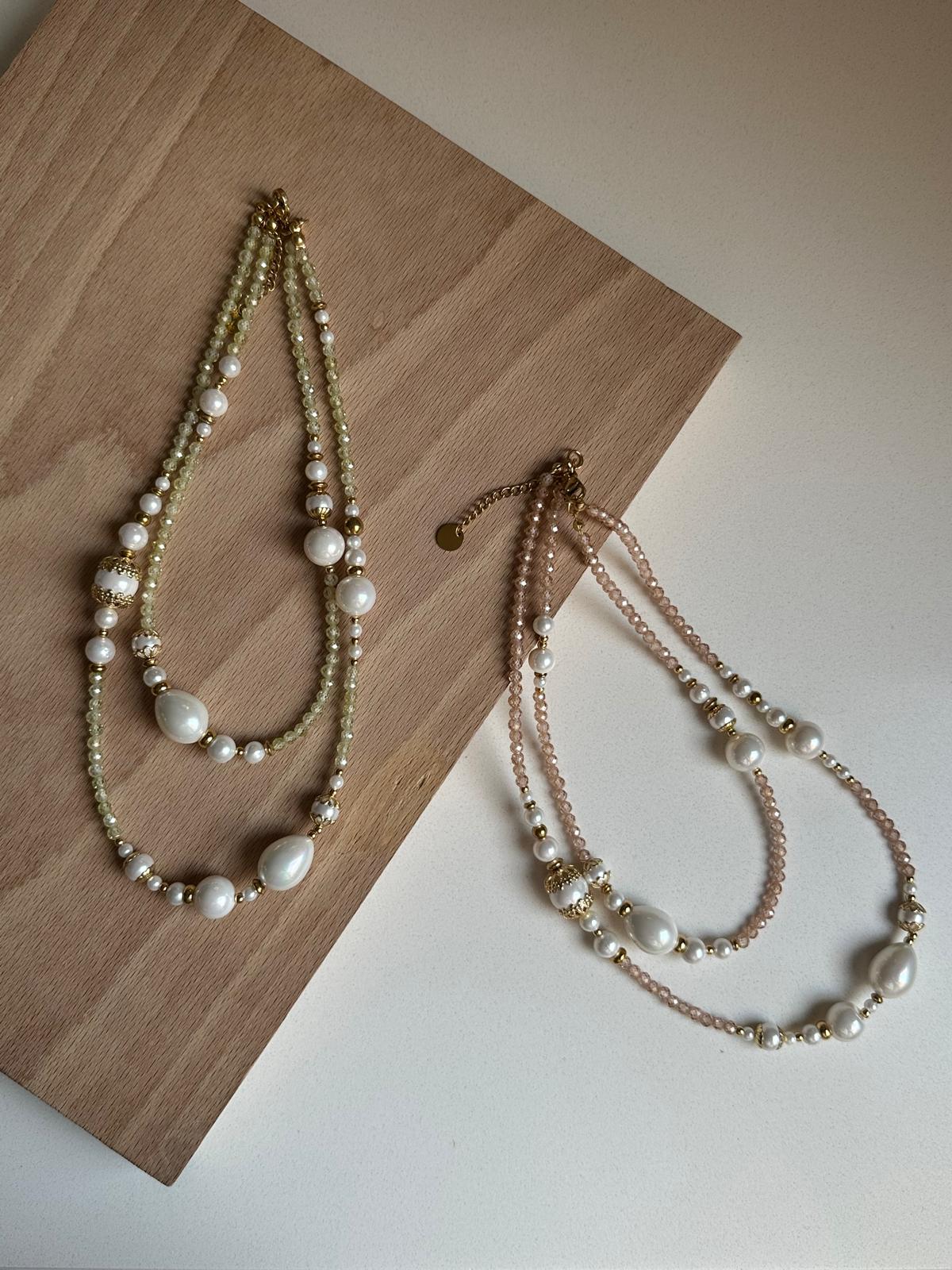 Collar doble de piedras de circonita y perlas blancas con muchos detalles en dorado (acero inox).