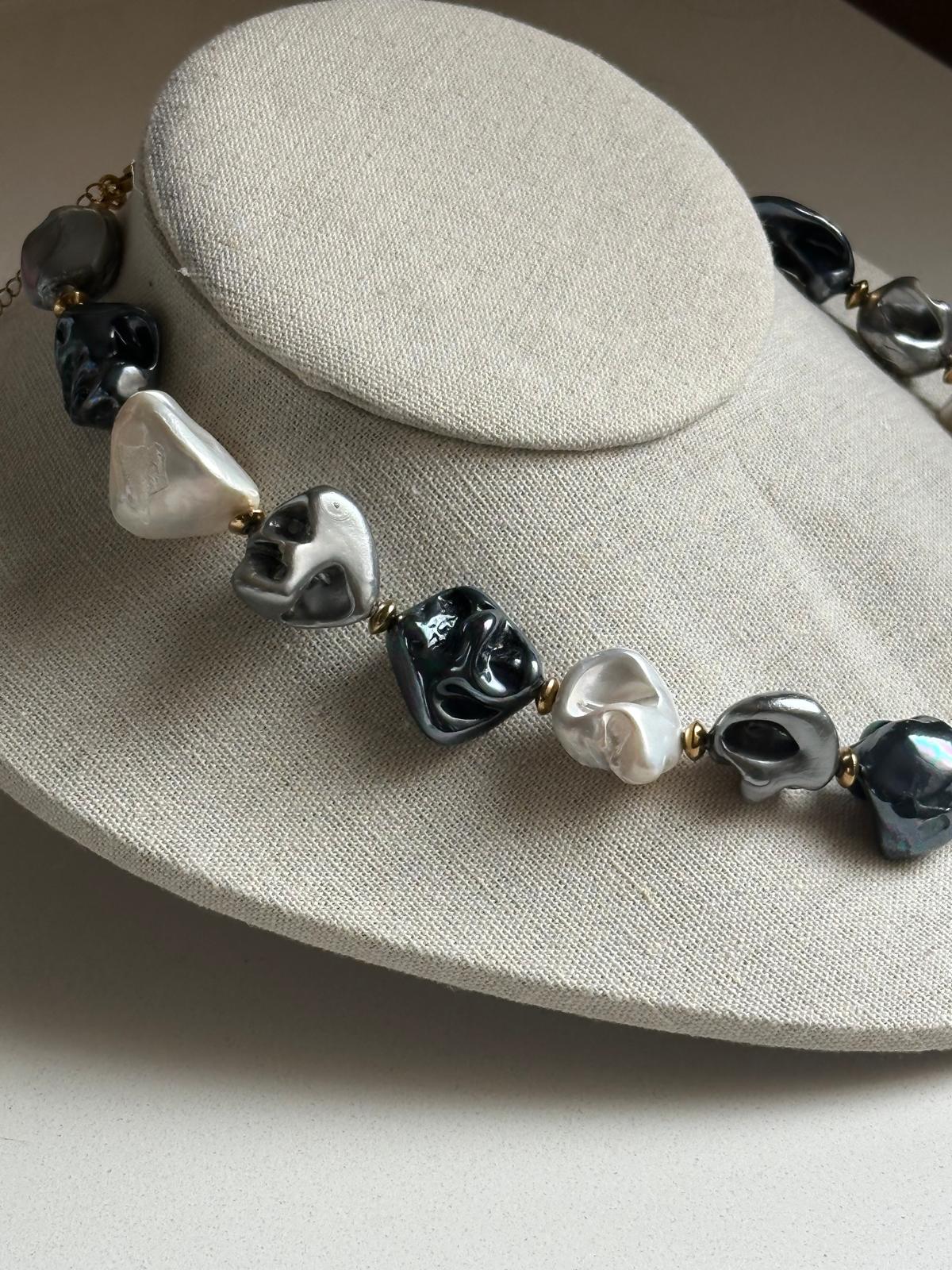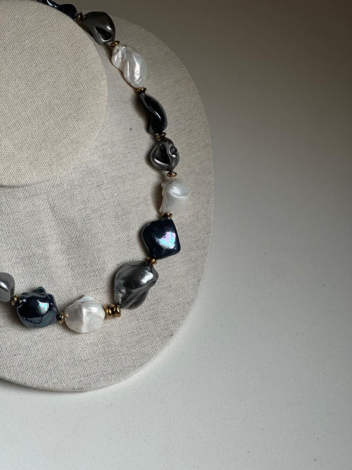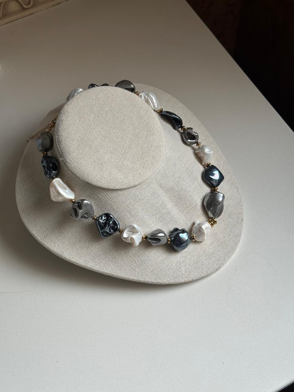 Piedras de río anacaradas en tonos grises conforman este precioso collar al que se le puede poner un charm en el medio.
