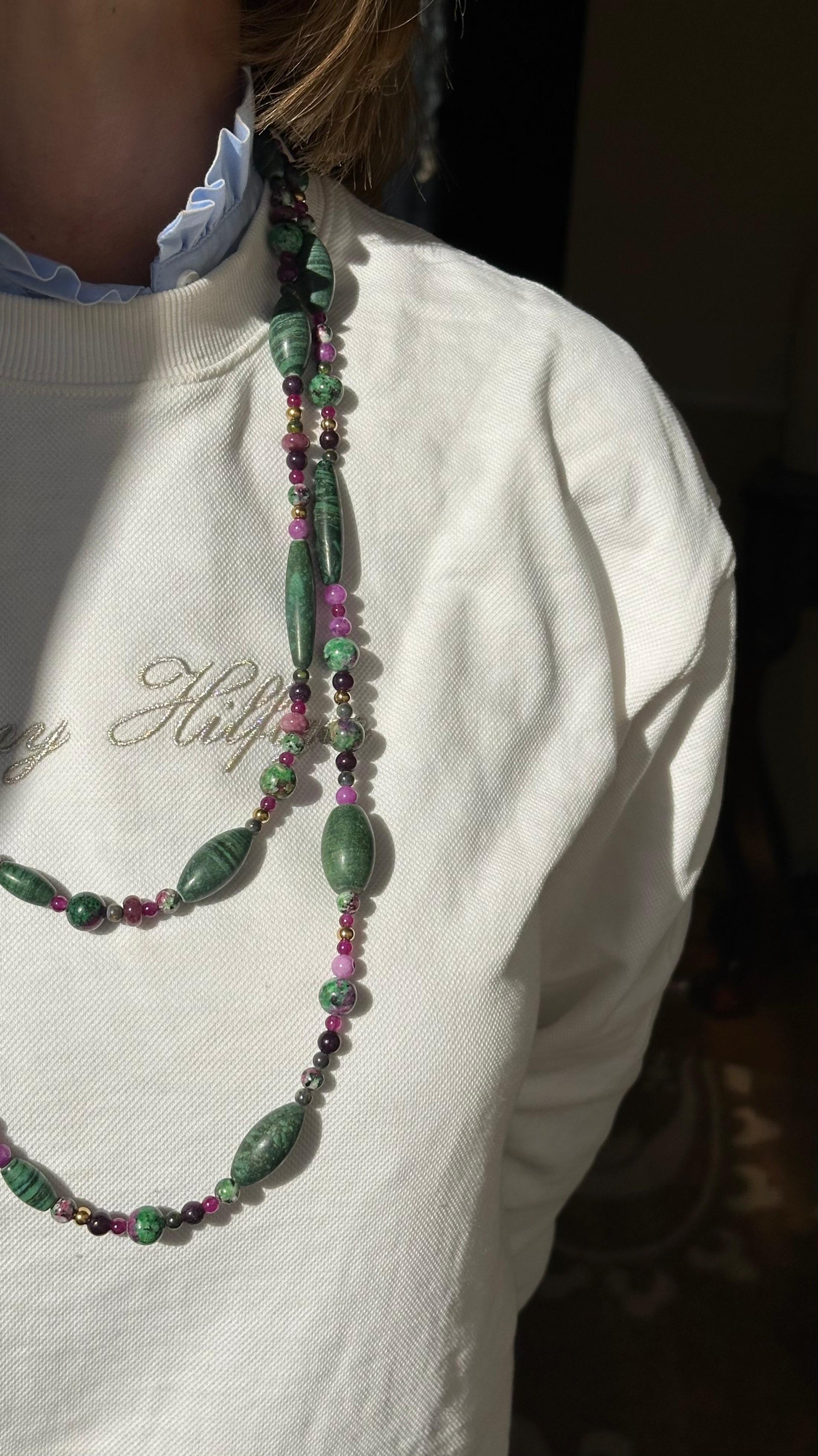Collares largos independientes en tonos verdes y morados. Tiene piedras de ágata naturales y cerámicas.