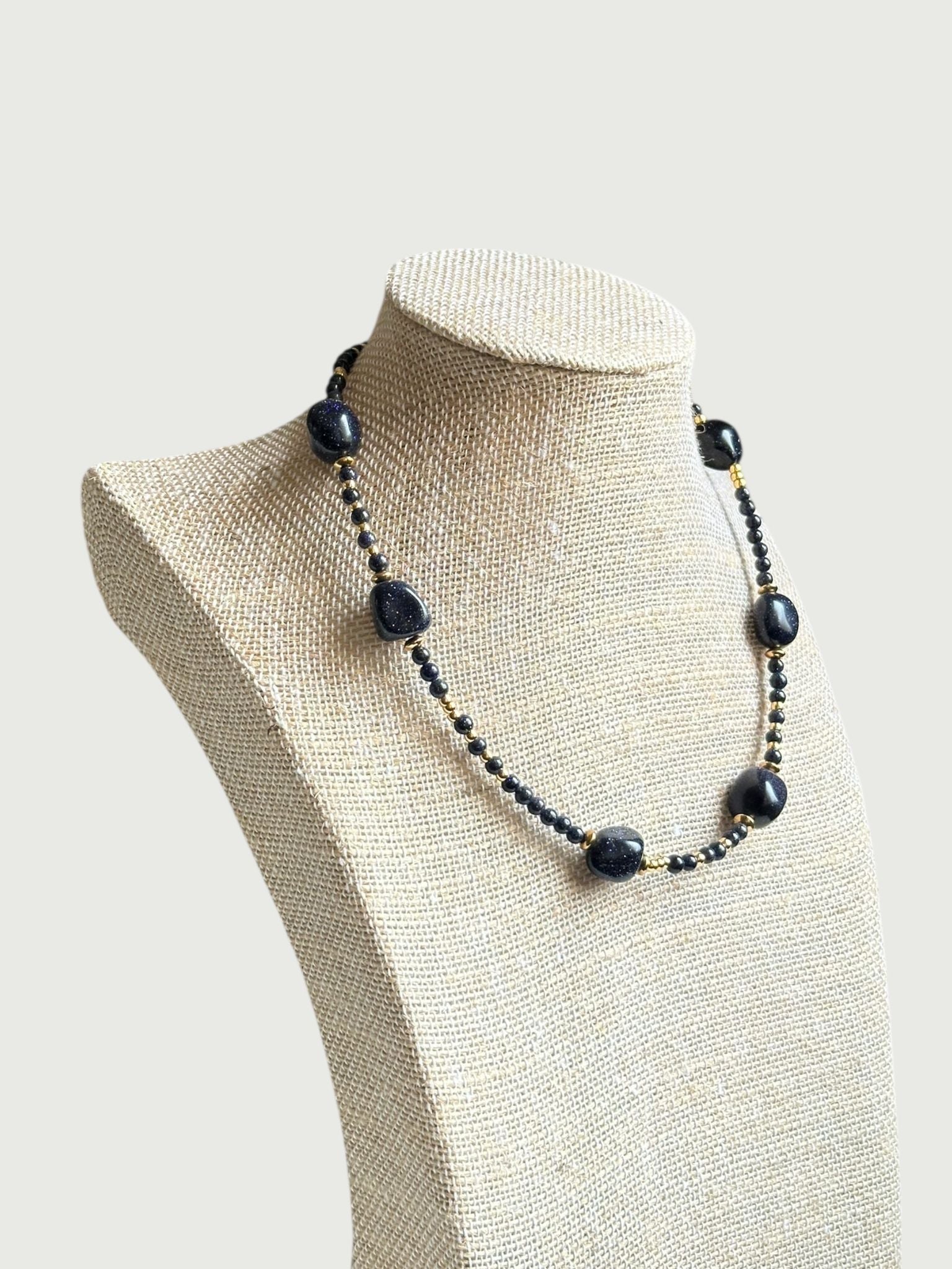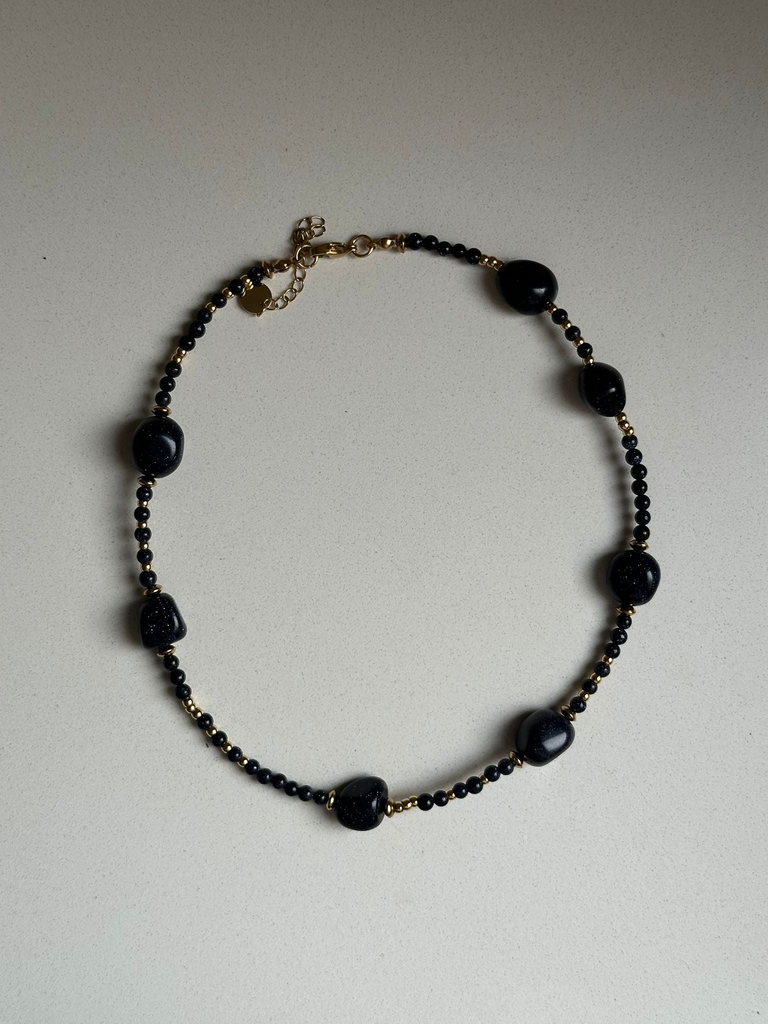 Formado por aventurina azul que se asocia a la calma y paz mental. Combinado también con detalles en dorado de acero inoxidable.