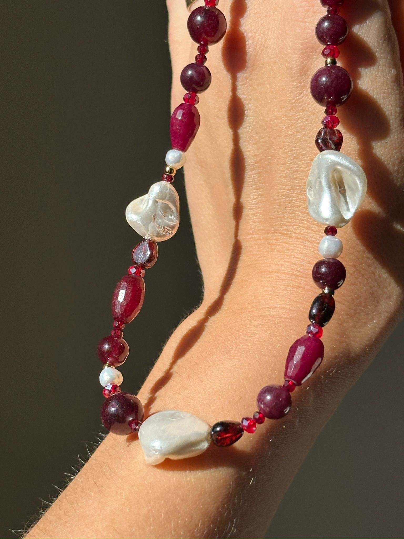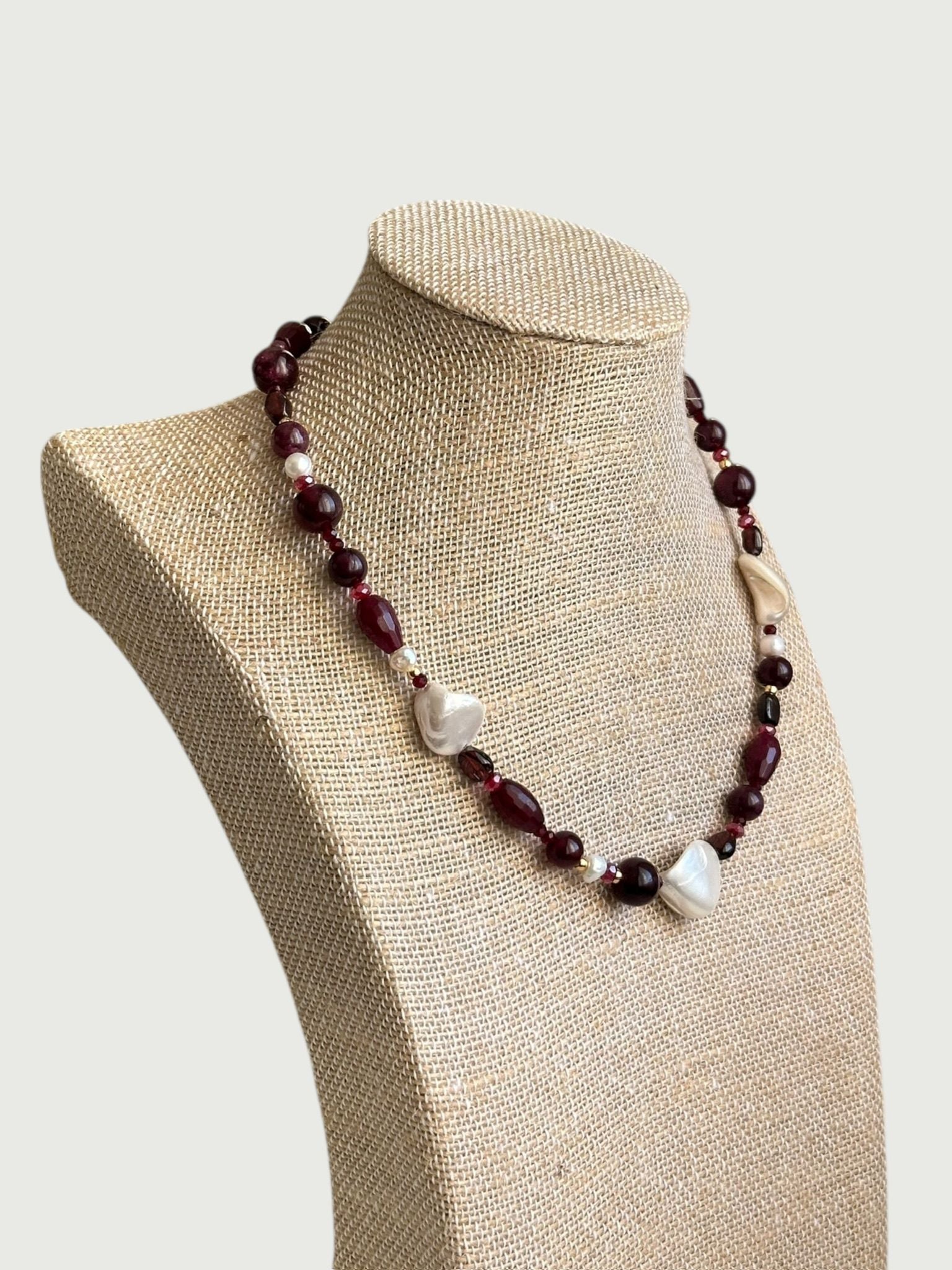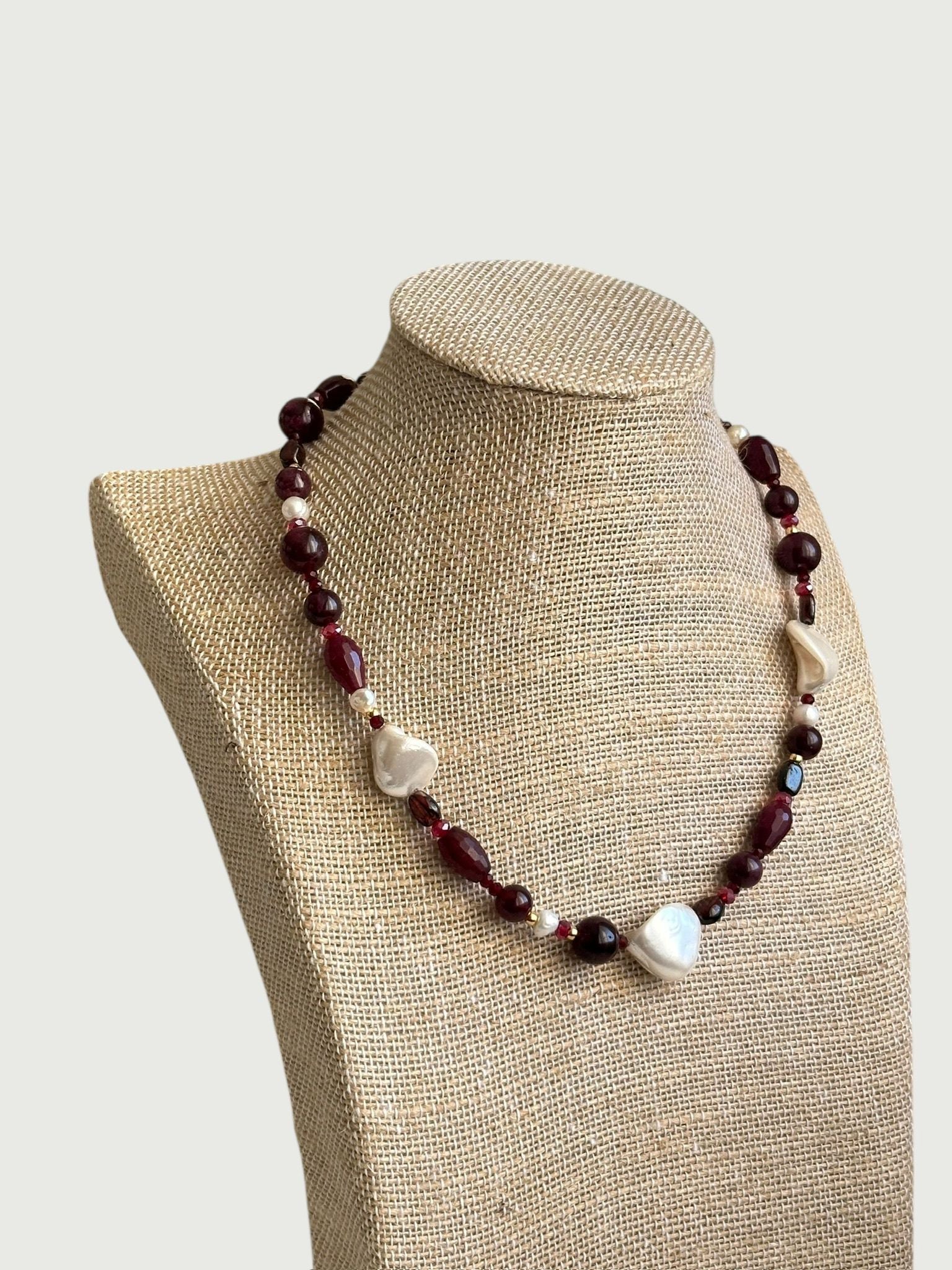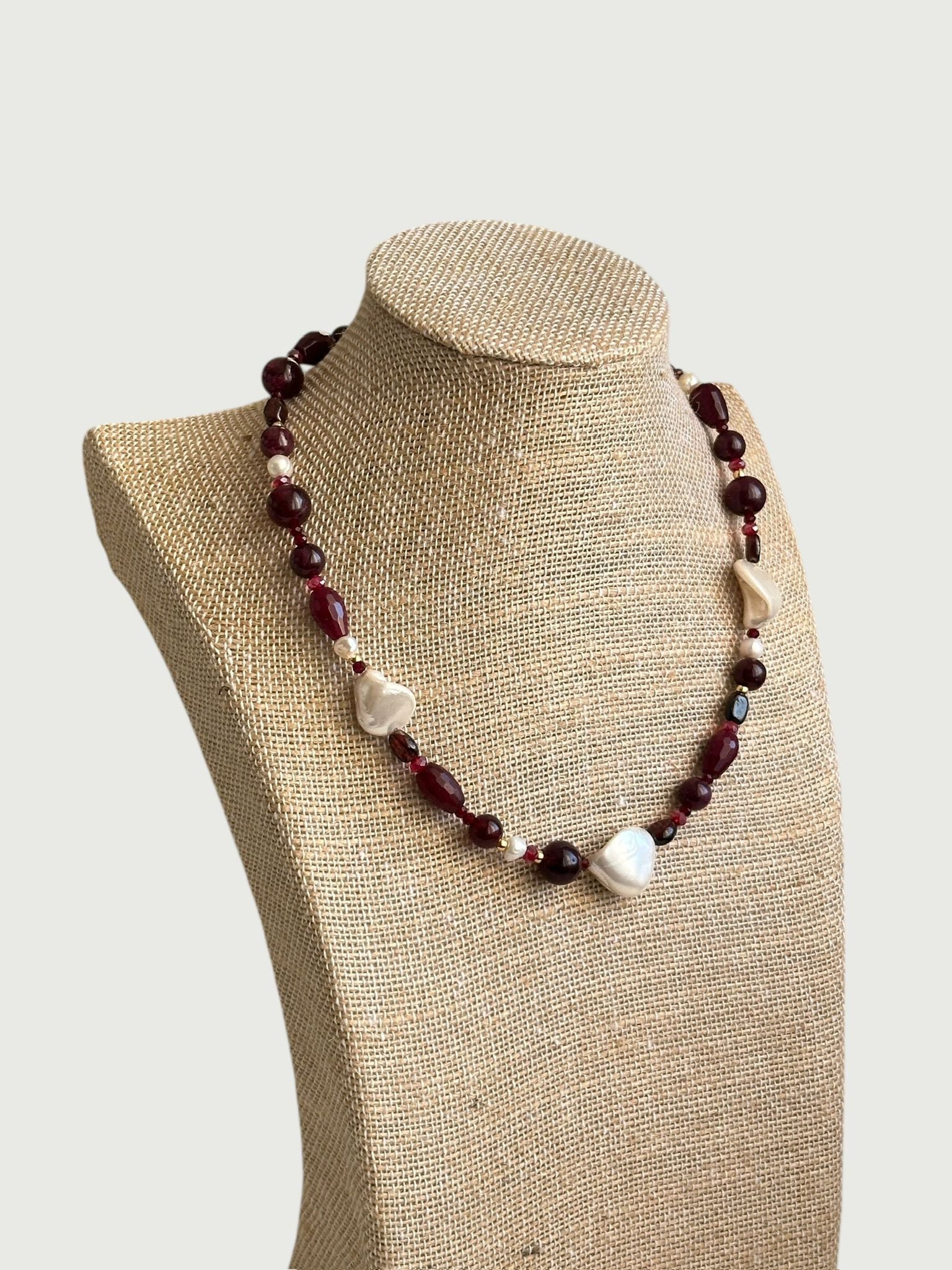 Formado por piedra natural granate. Combinado también con detalles en dorado de acero inoxidable y perlas de río en tono blanco.