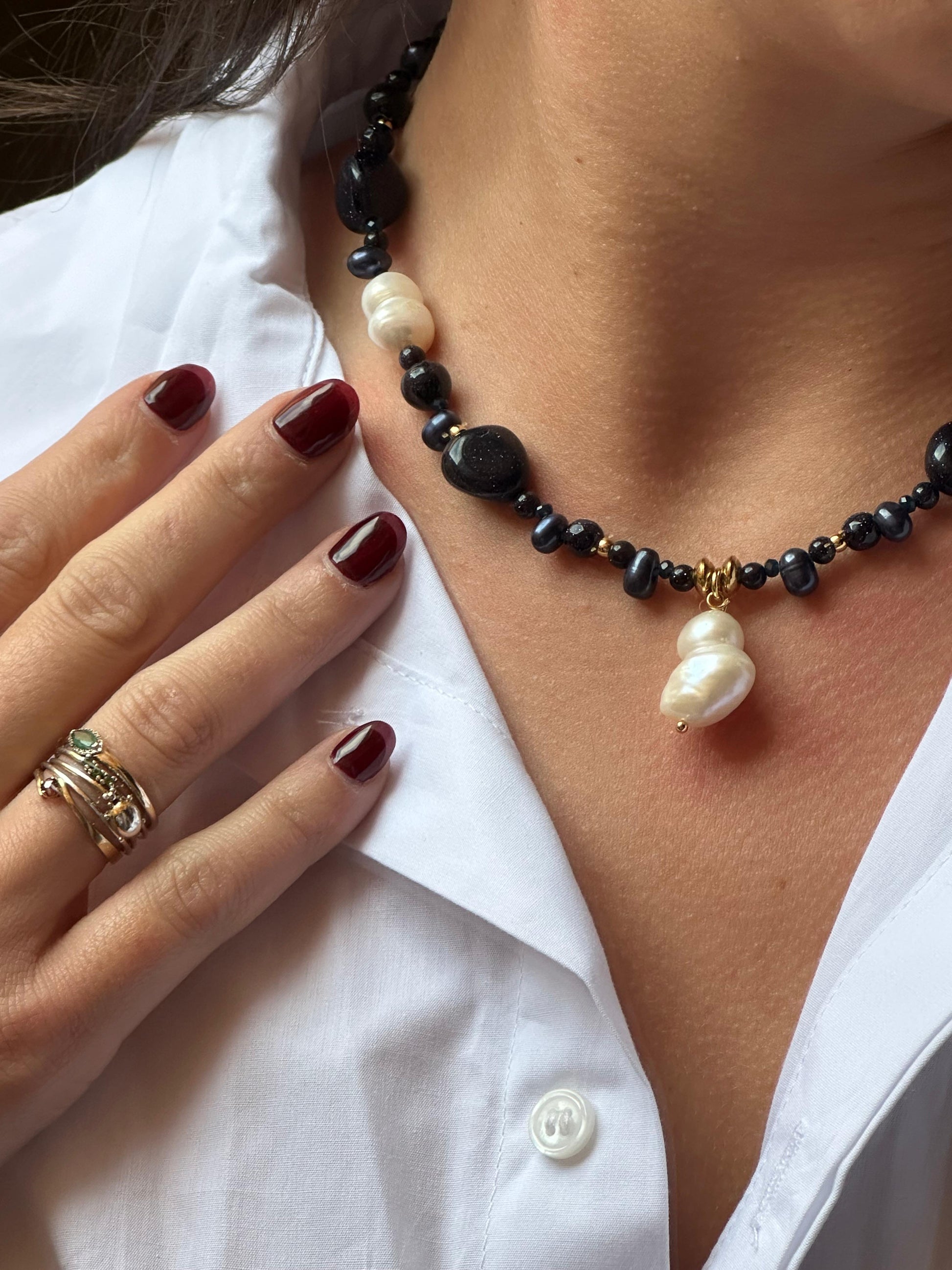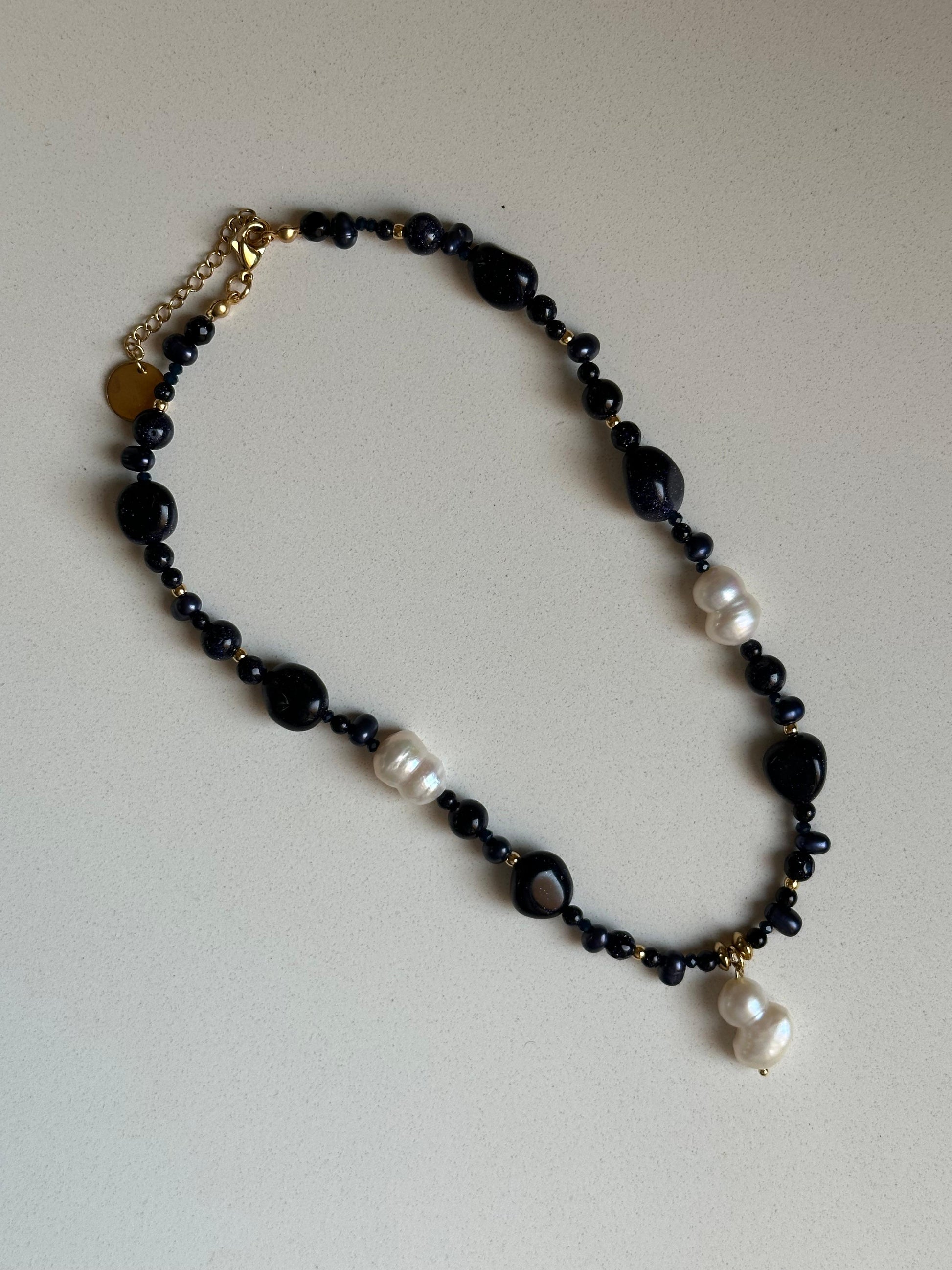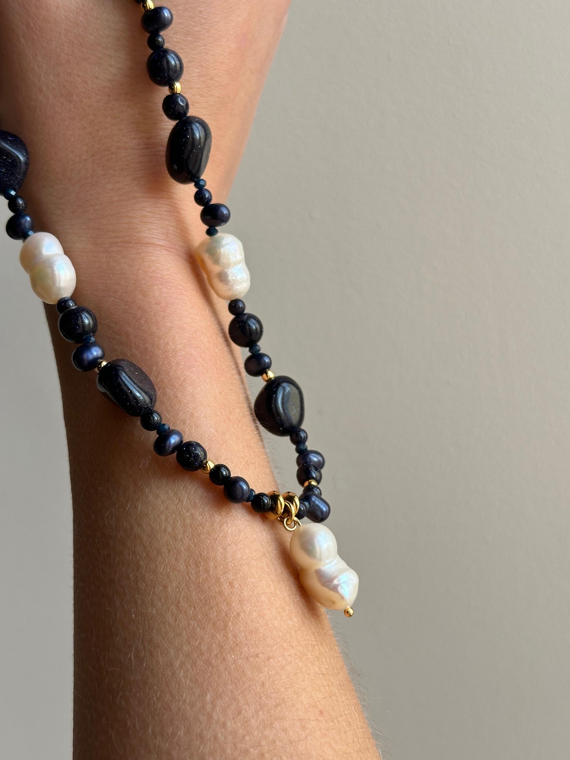 Formado por aventurina azul que se asocia a la calma y paz mental. Combinado con esas destacadas perlas de río cultivadas en agua dulce en tono blanco y también con detalles en dorado de acero inoxidable.
