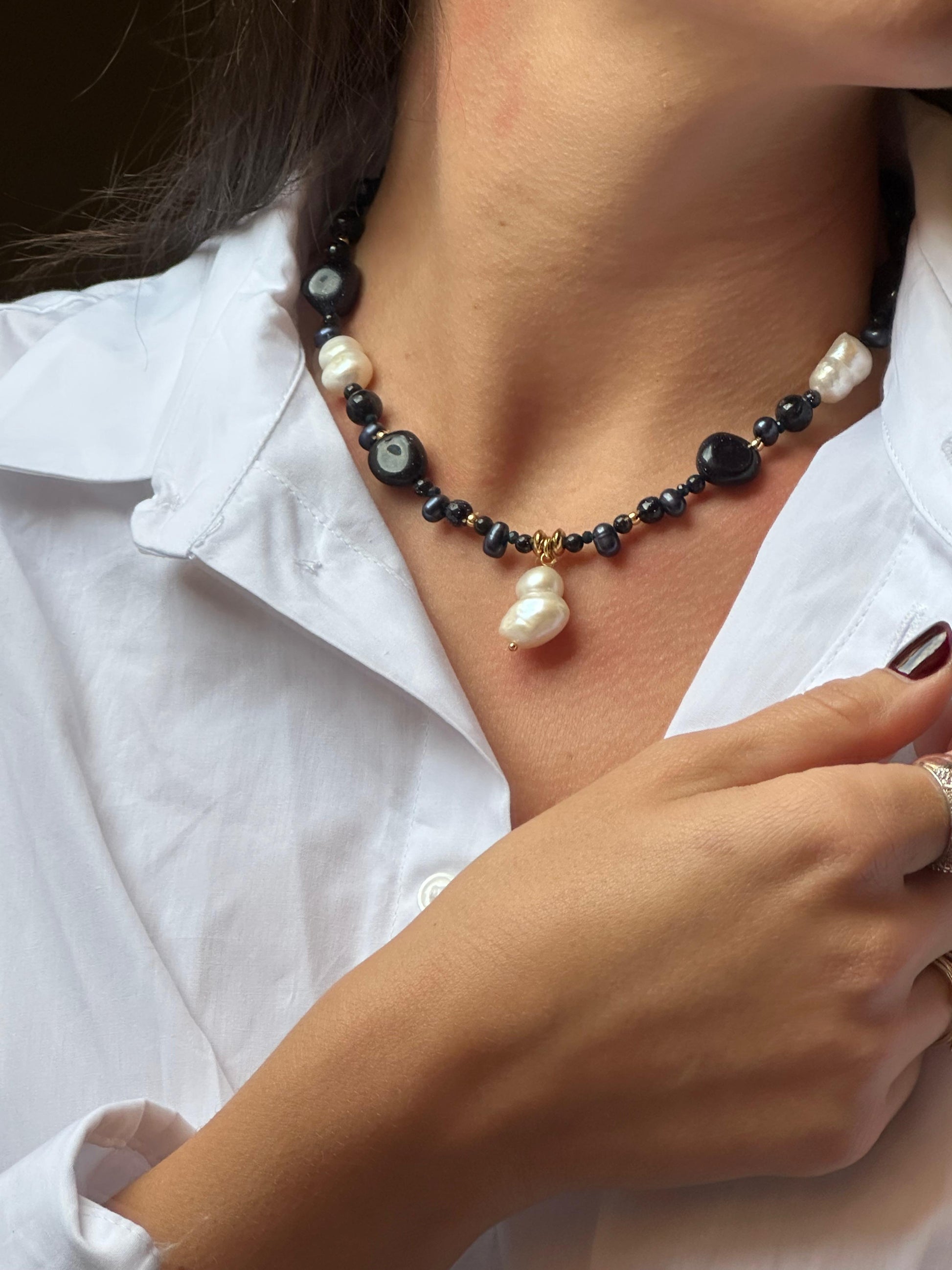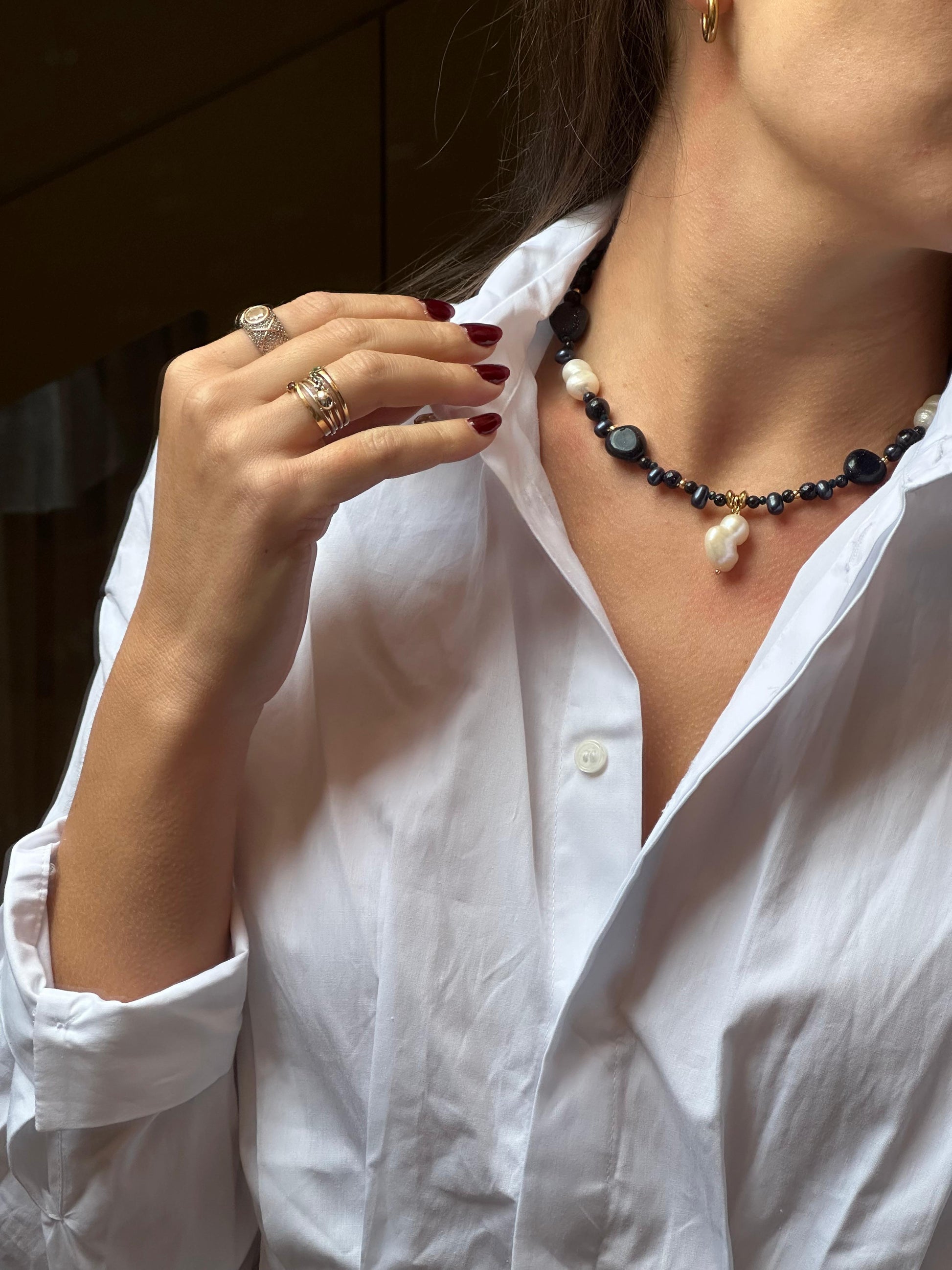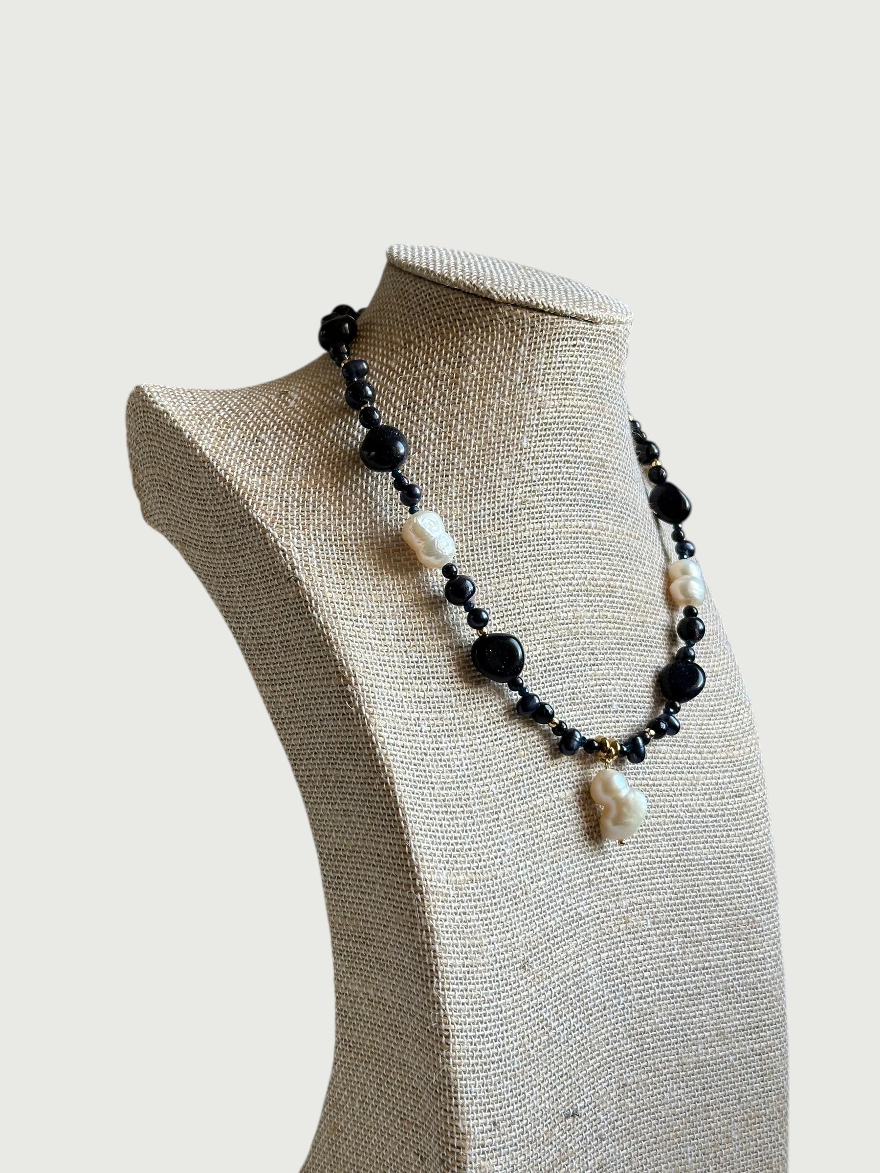 Formado por aventurina azul que se asocia a la calma y paz mental. Combinado con esas destacadas perlas de río cultivadas en agua dulce en tono blanco y también con detalles en dorado de acero inoxidable.