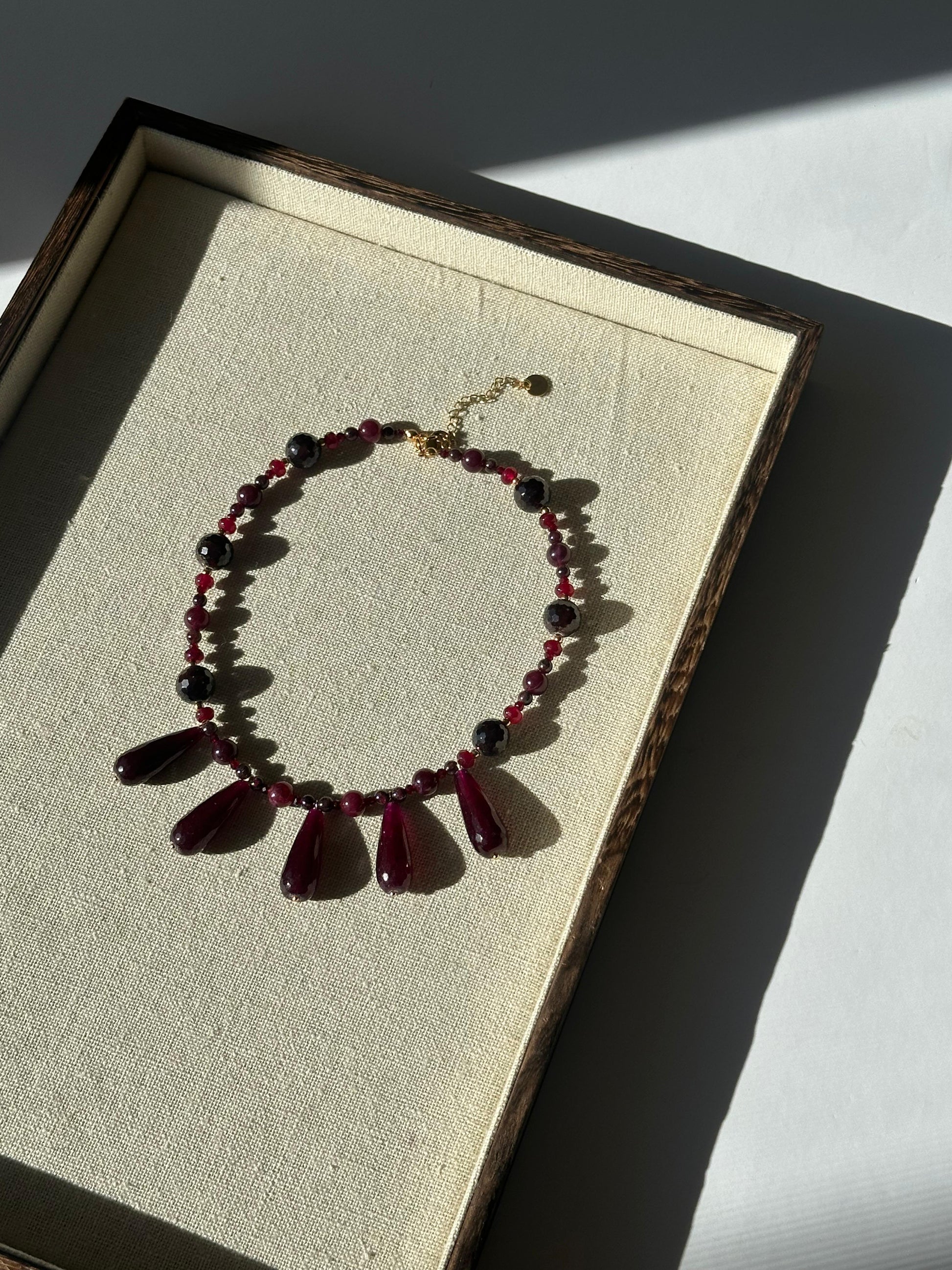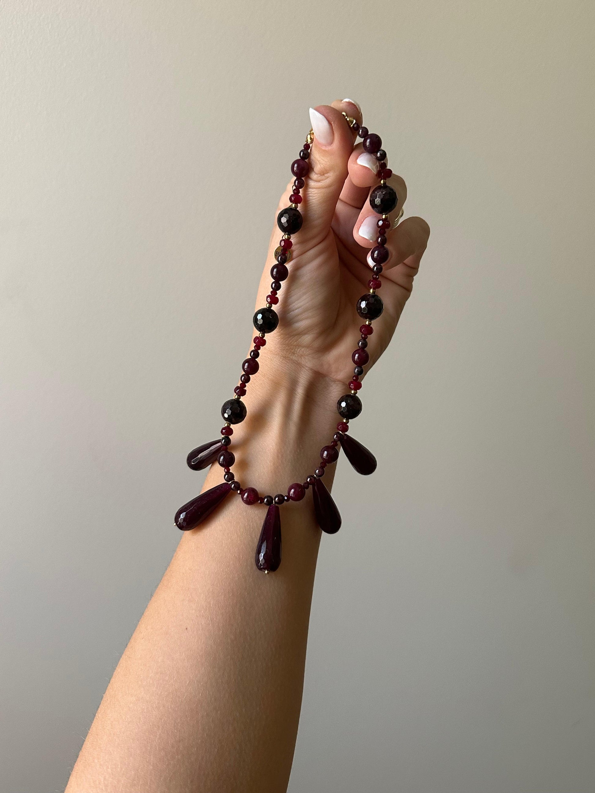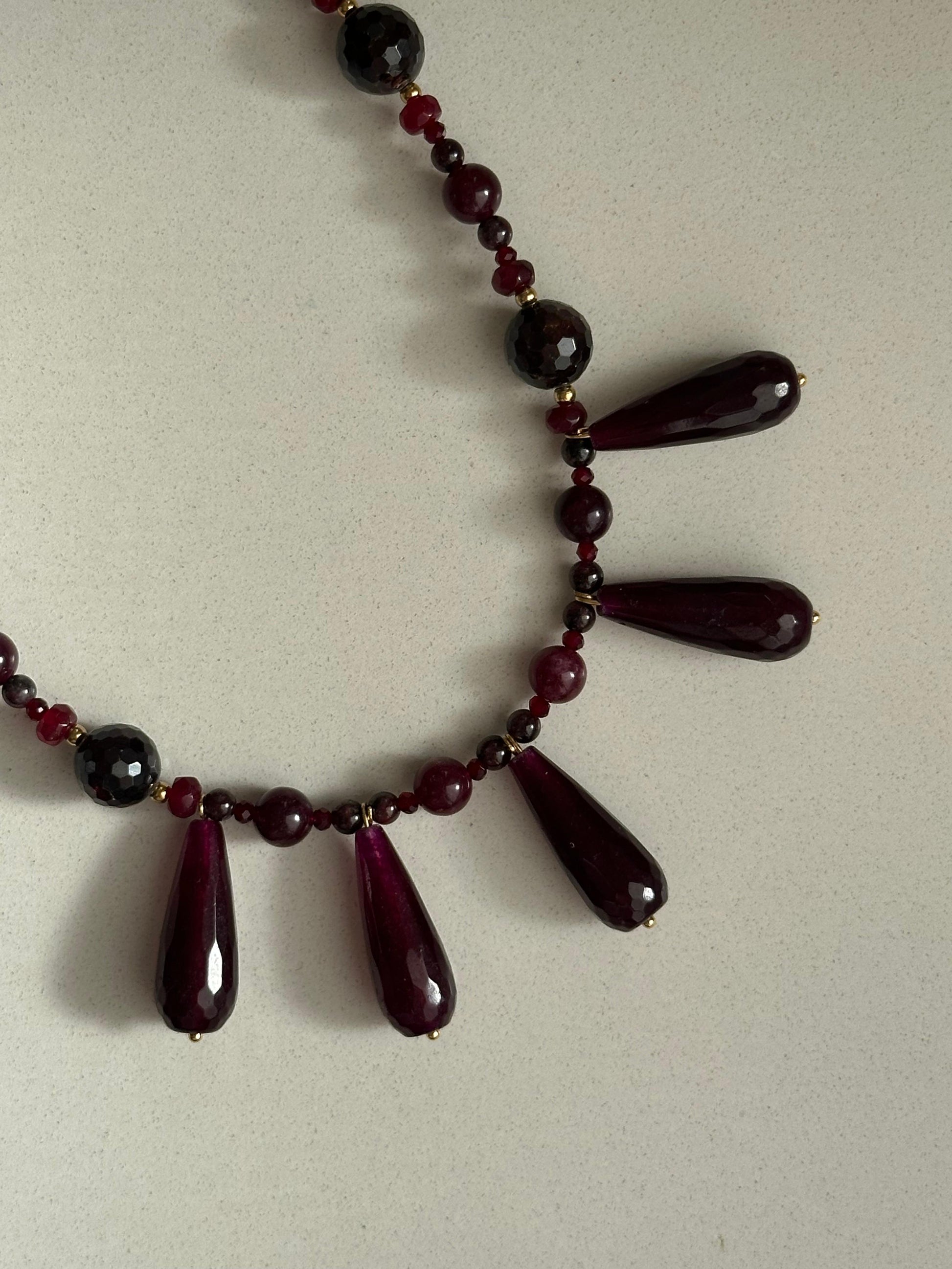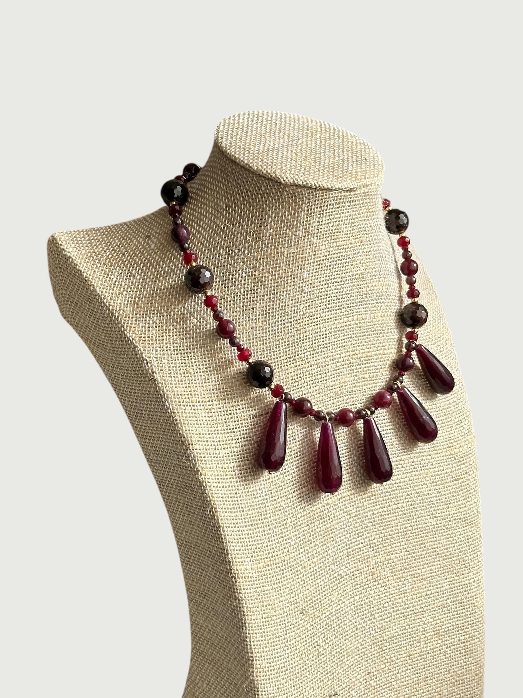 Formado por mineral granate que se le asocia con la vitalidad, la protección contra energías negativas y el equilibrio emocional. Cuelgan del centro 5 piezas ovaladas de piedra granate también. Tiene detalles en dorado de acero inoxidable.