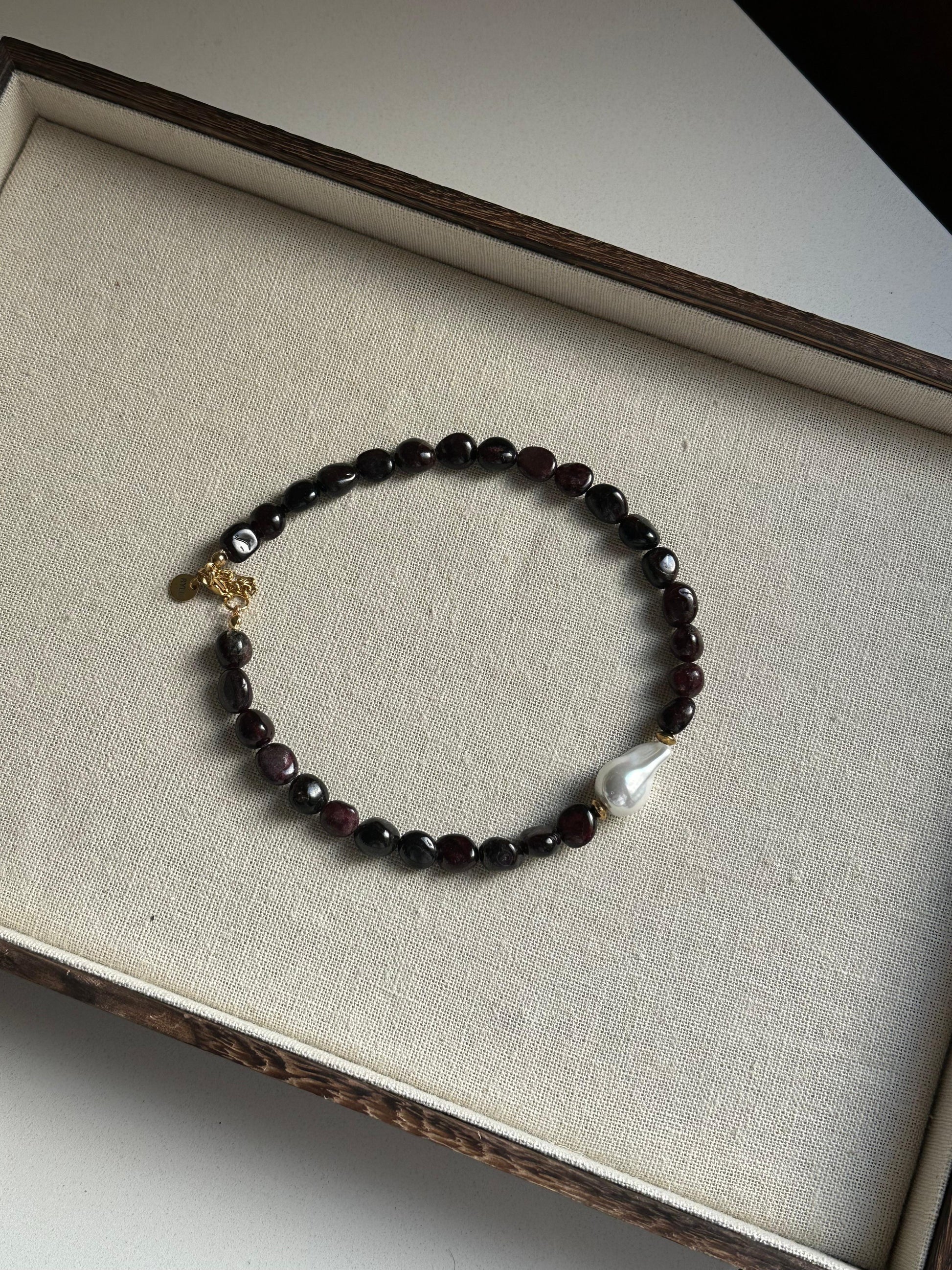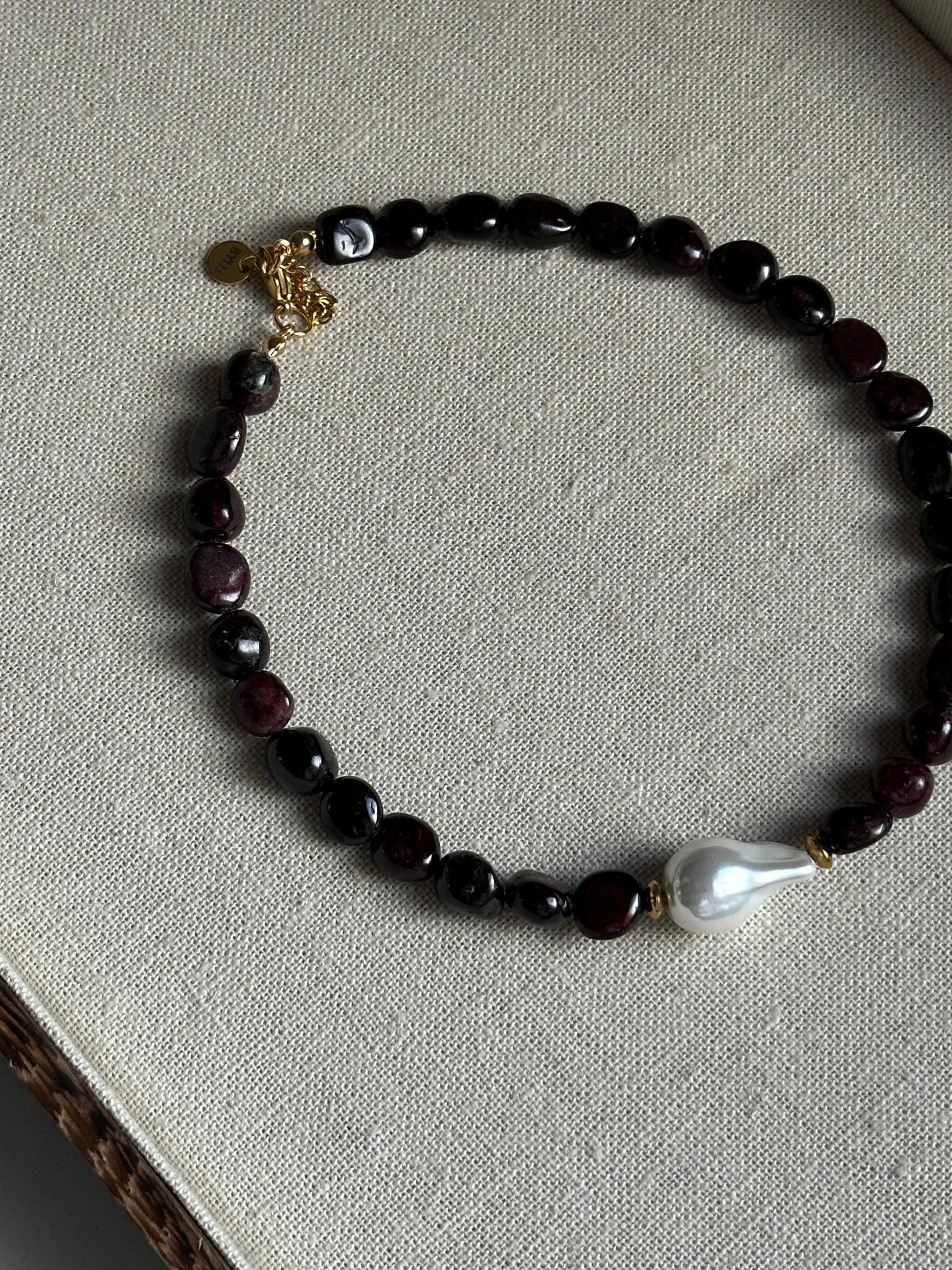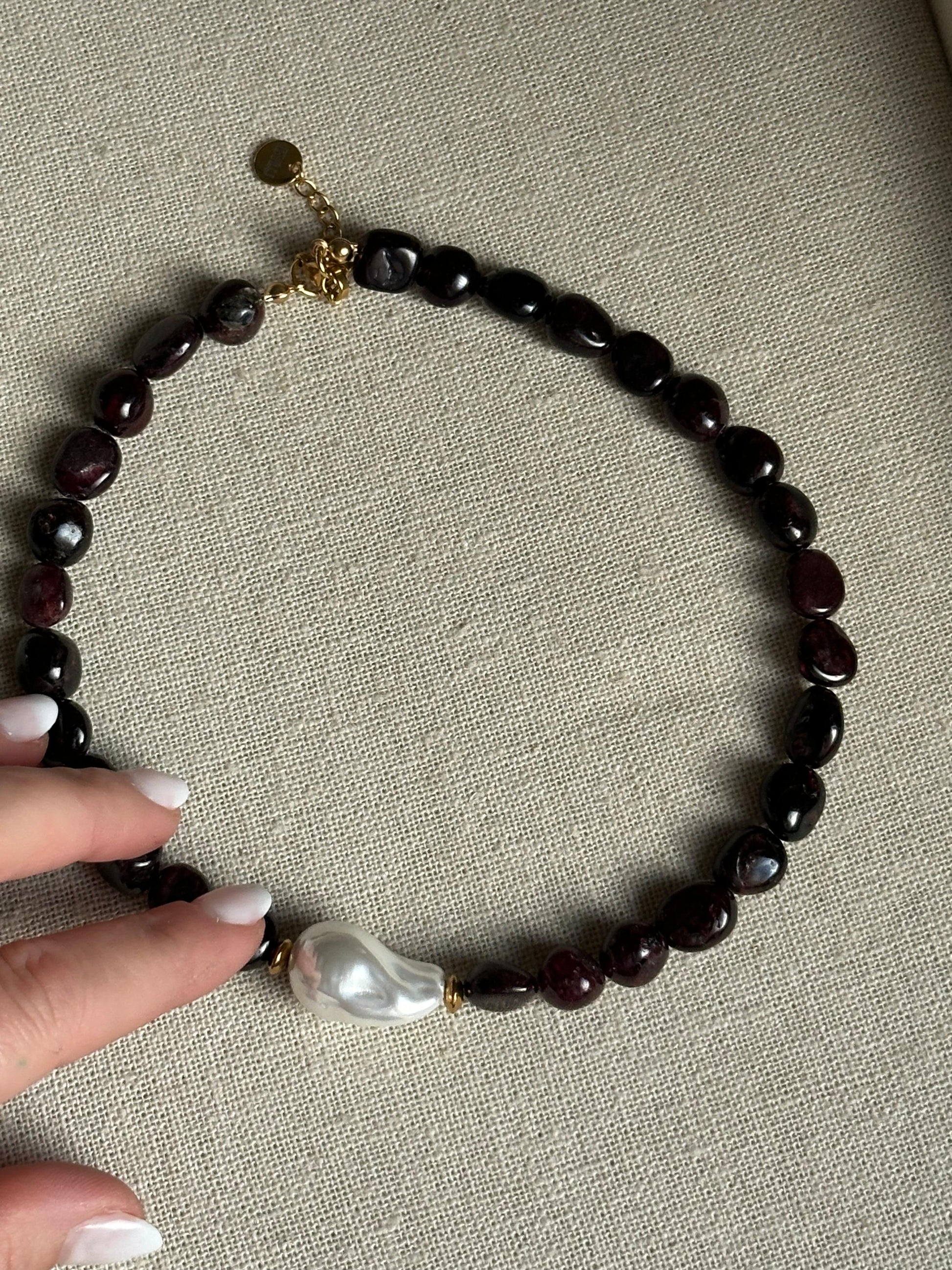 Formado por mineral granate que se le asocia con la vitalidad, la protección contra energías negativas y el equilibrio emocional. En el lateral tiene una pieza blanca de perla de río y queda pegadito al cuello.