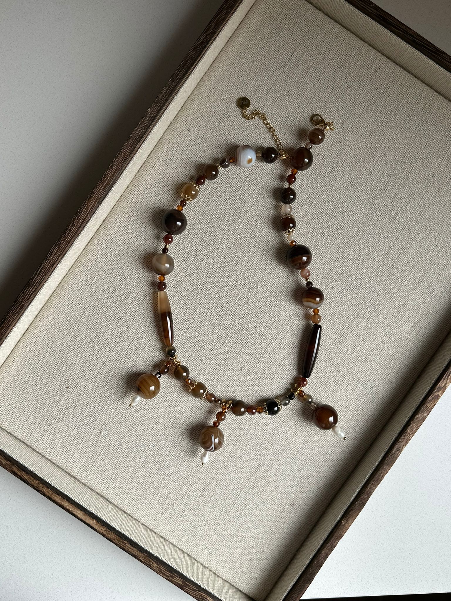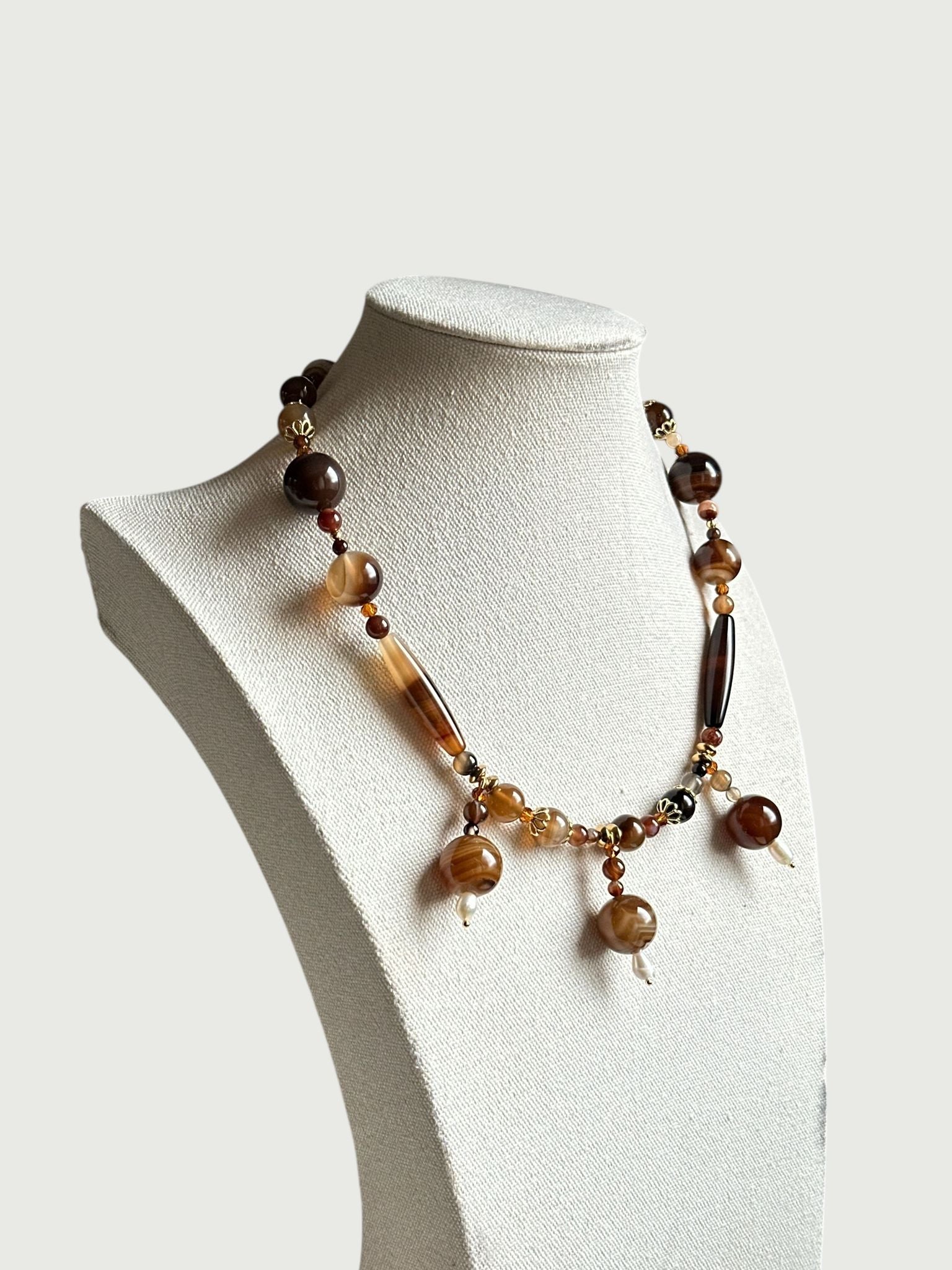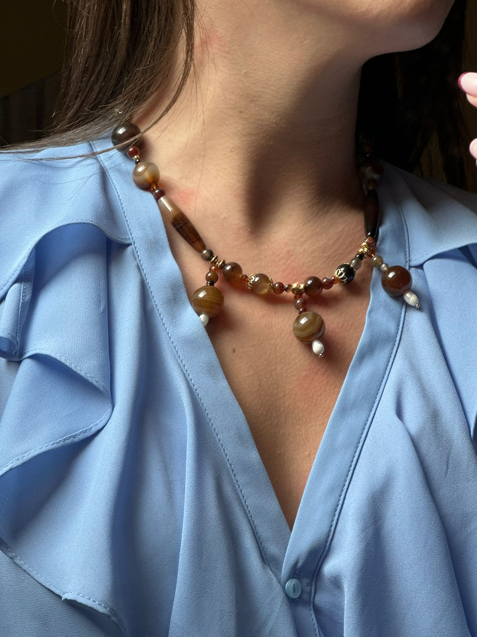 Formado por piedras de ágata en diferentes tonos de marrones. Combinado con detalles en dorado de acero inoxidable. Tiene colgando del centro 3 piezas de ágata con perlas de río blancas.
