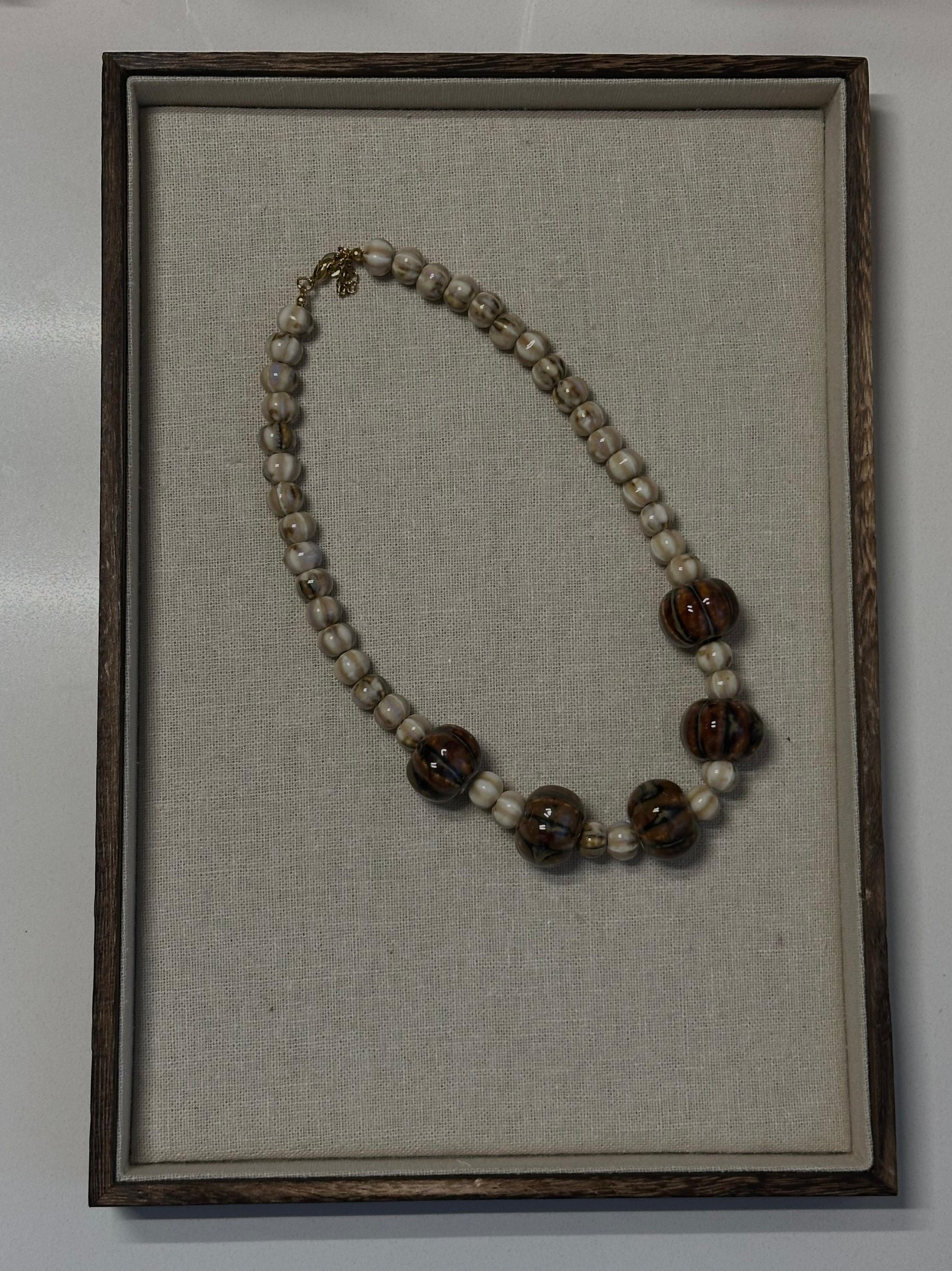 Collar de piezas de cerámica en tono beige y le acompañan 5 piezas más grandes en tono marrón. Perfecto para combinarlo con el color de la temporada: el marrón.