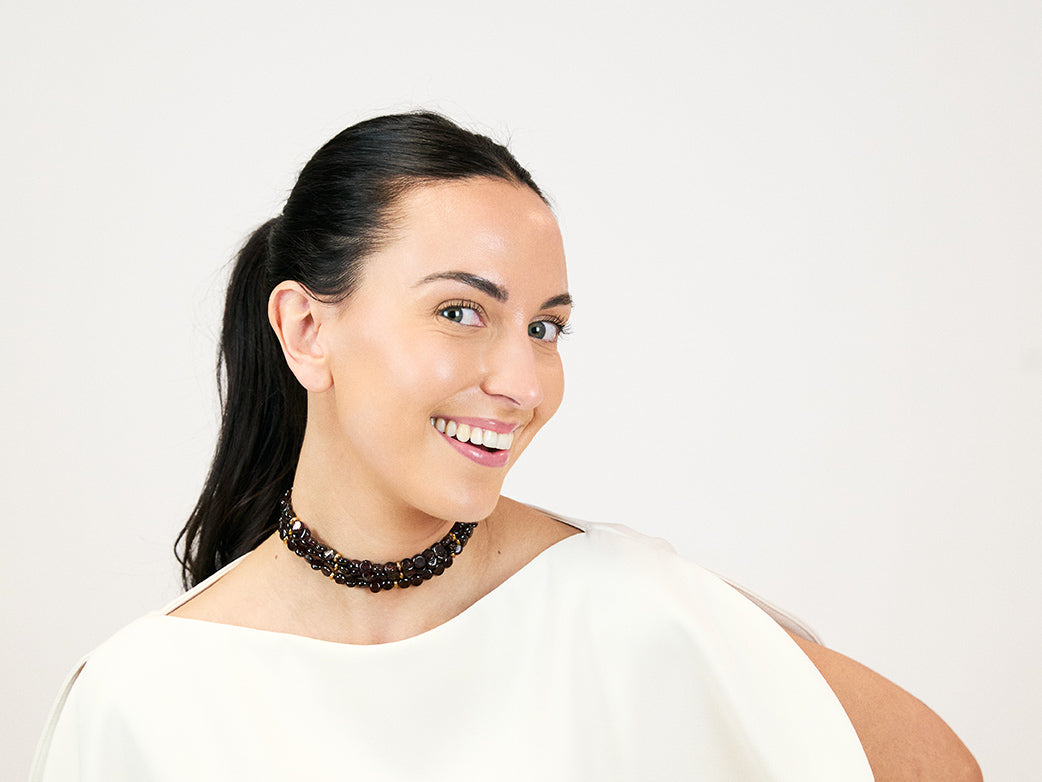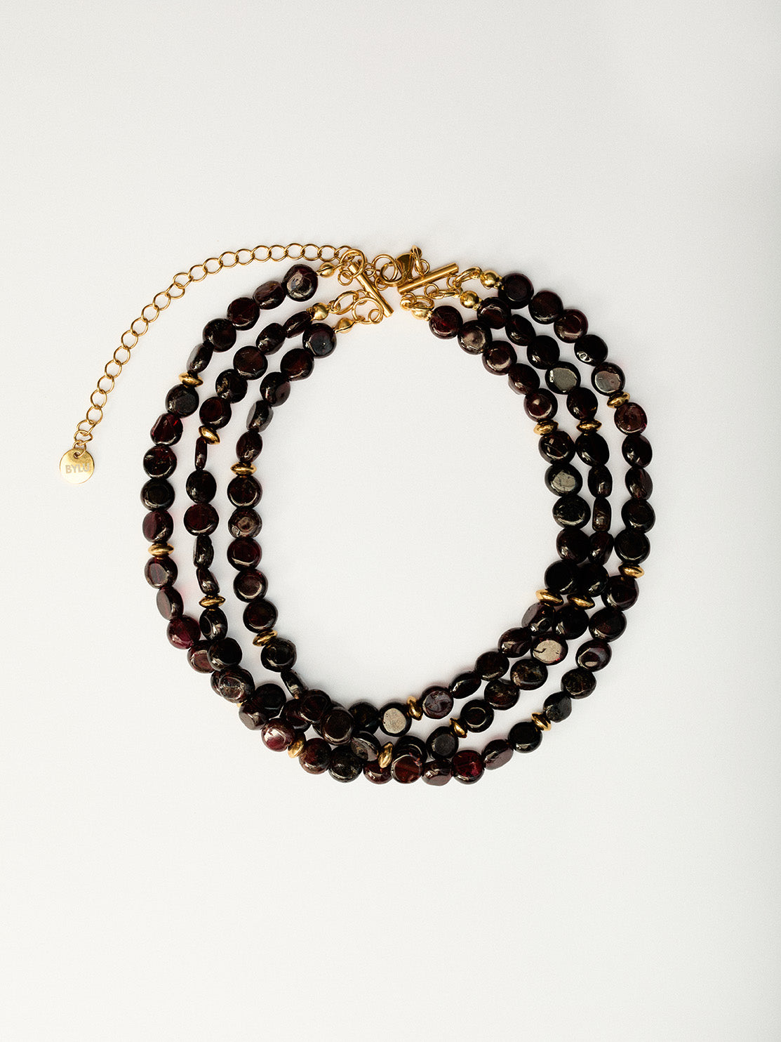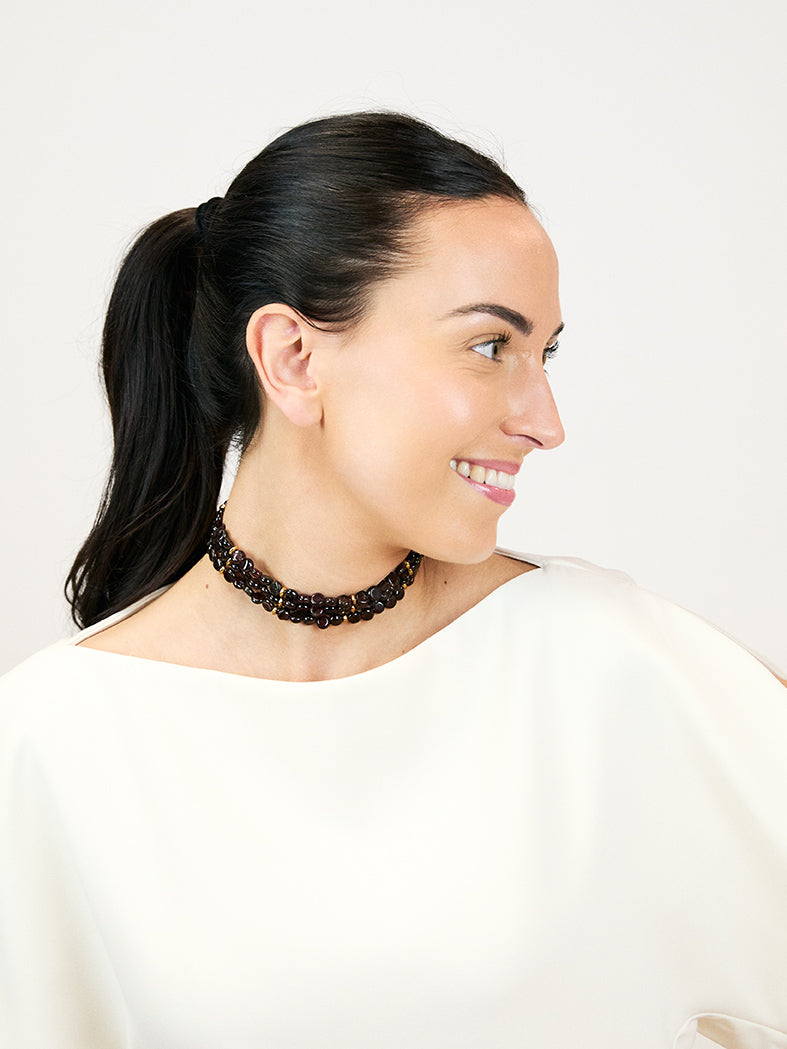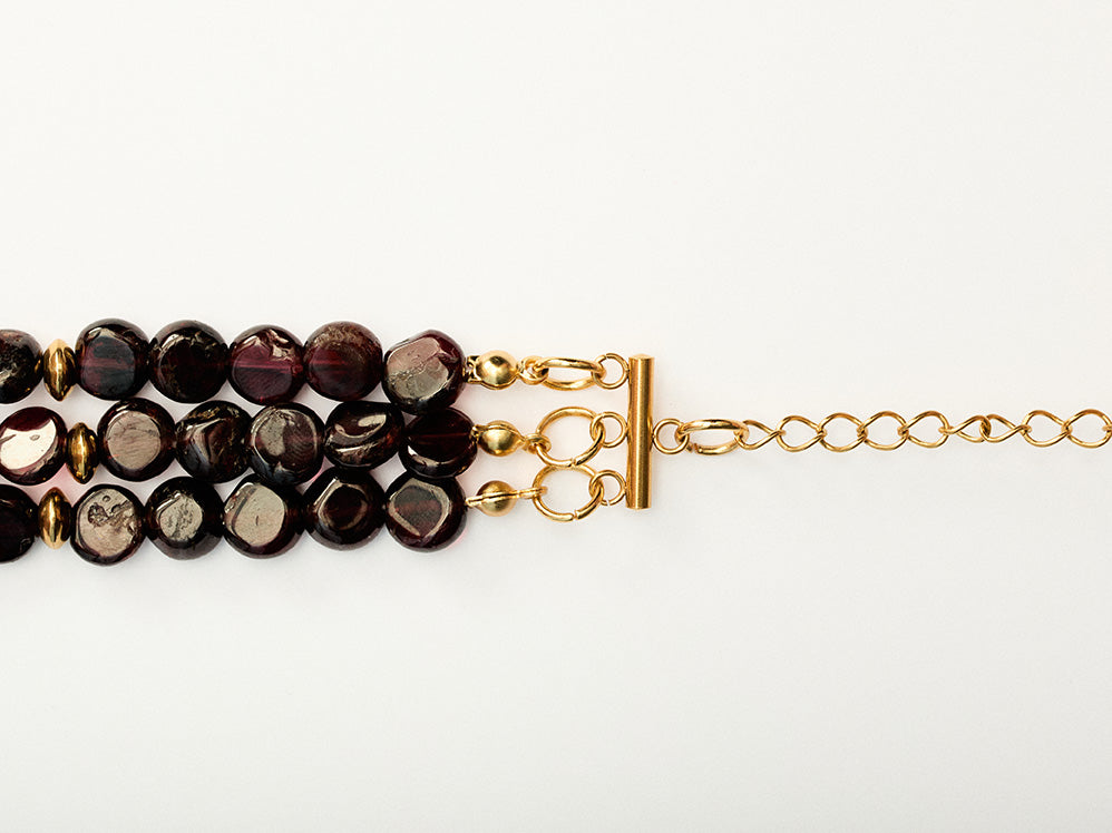 Collar estilo choker de piedras naturales de granates. Tiene tres tiras de cuello. Entre medias de los abalorios cuenta con unas piezas doradas en acero inoxidable.