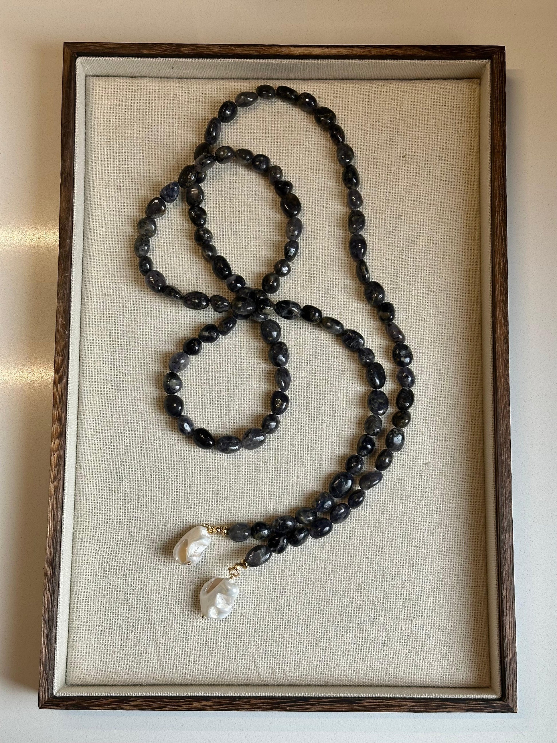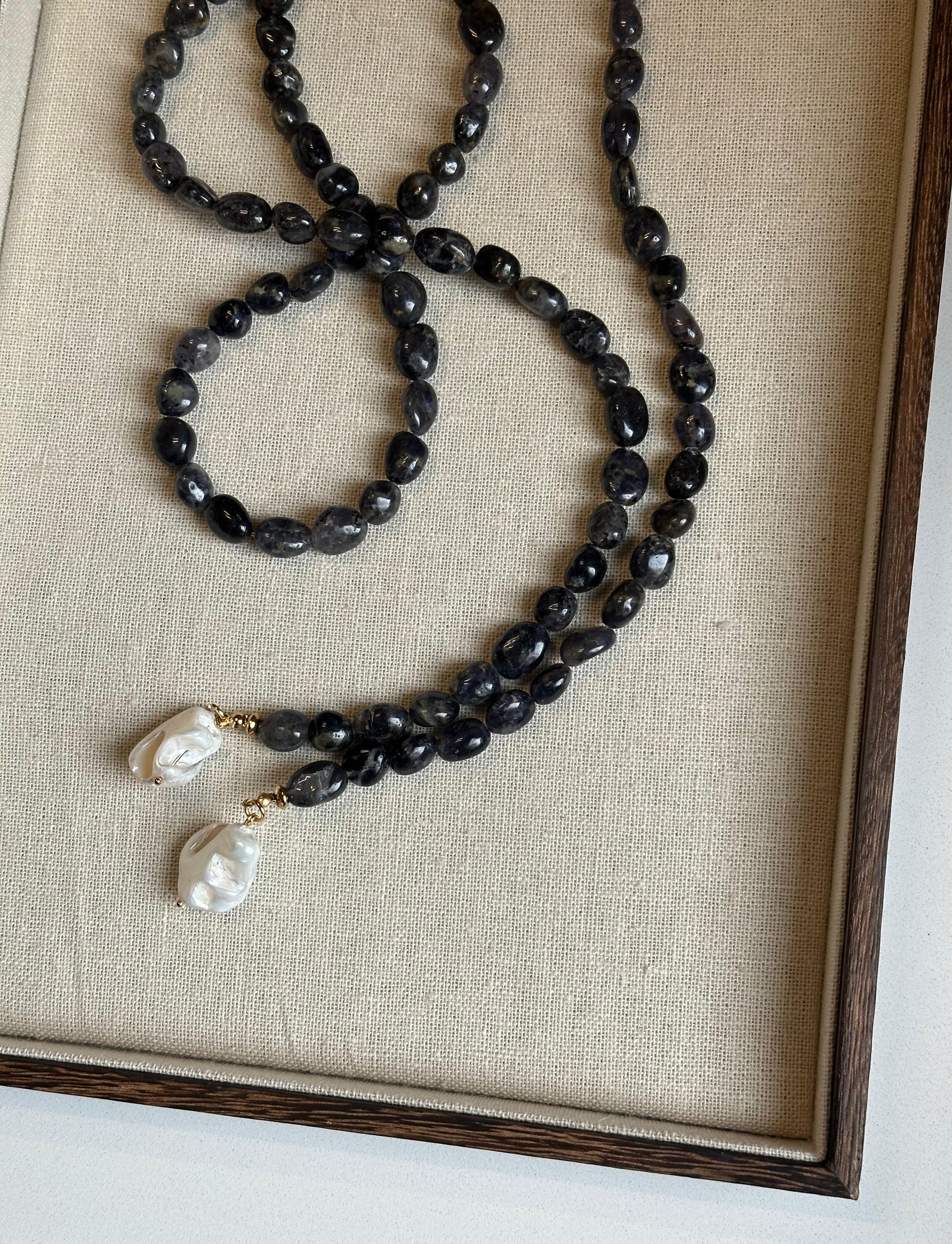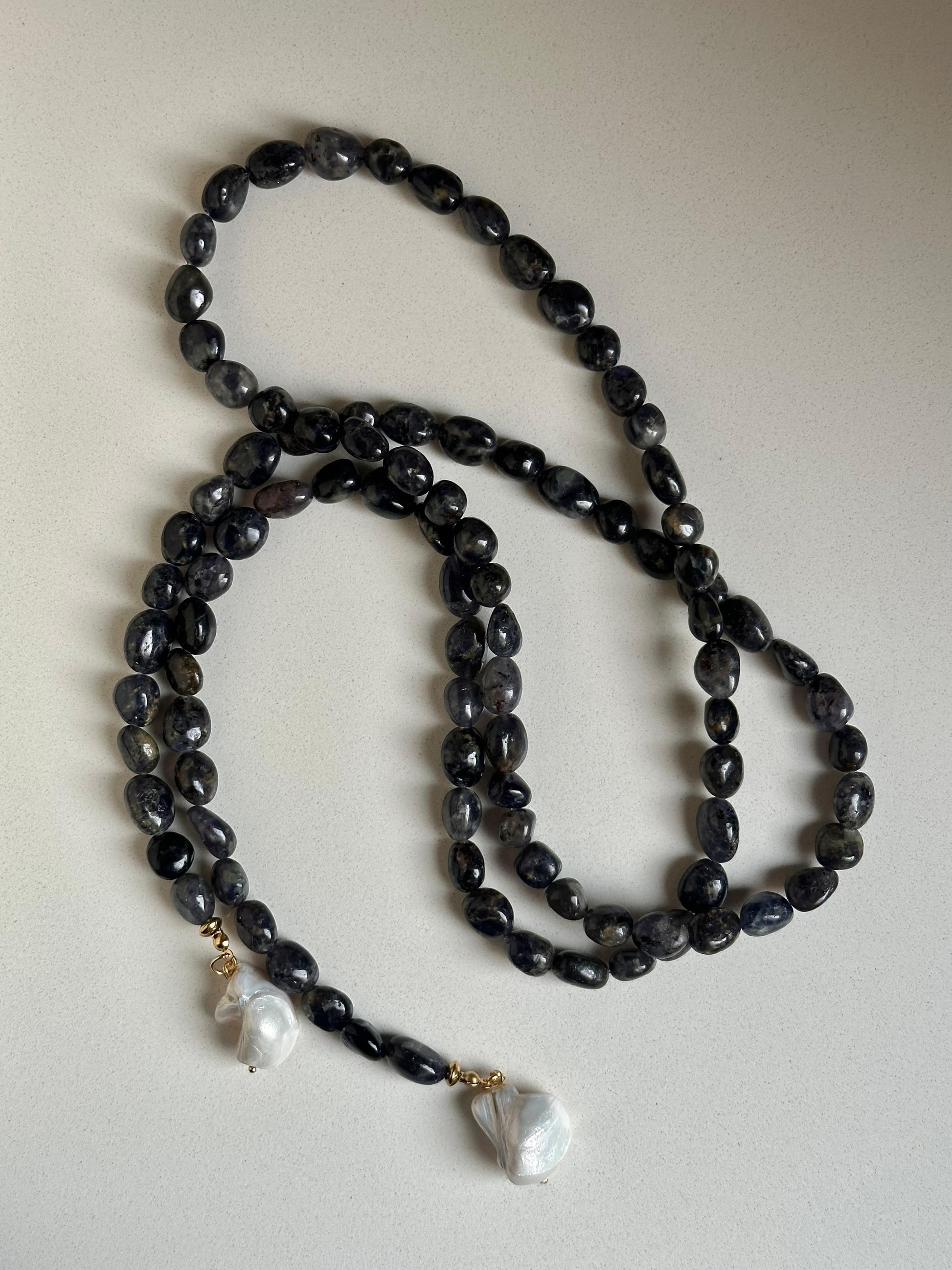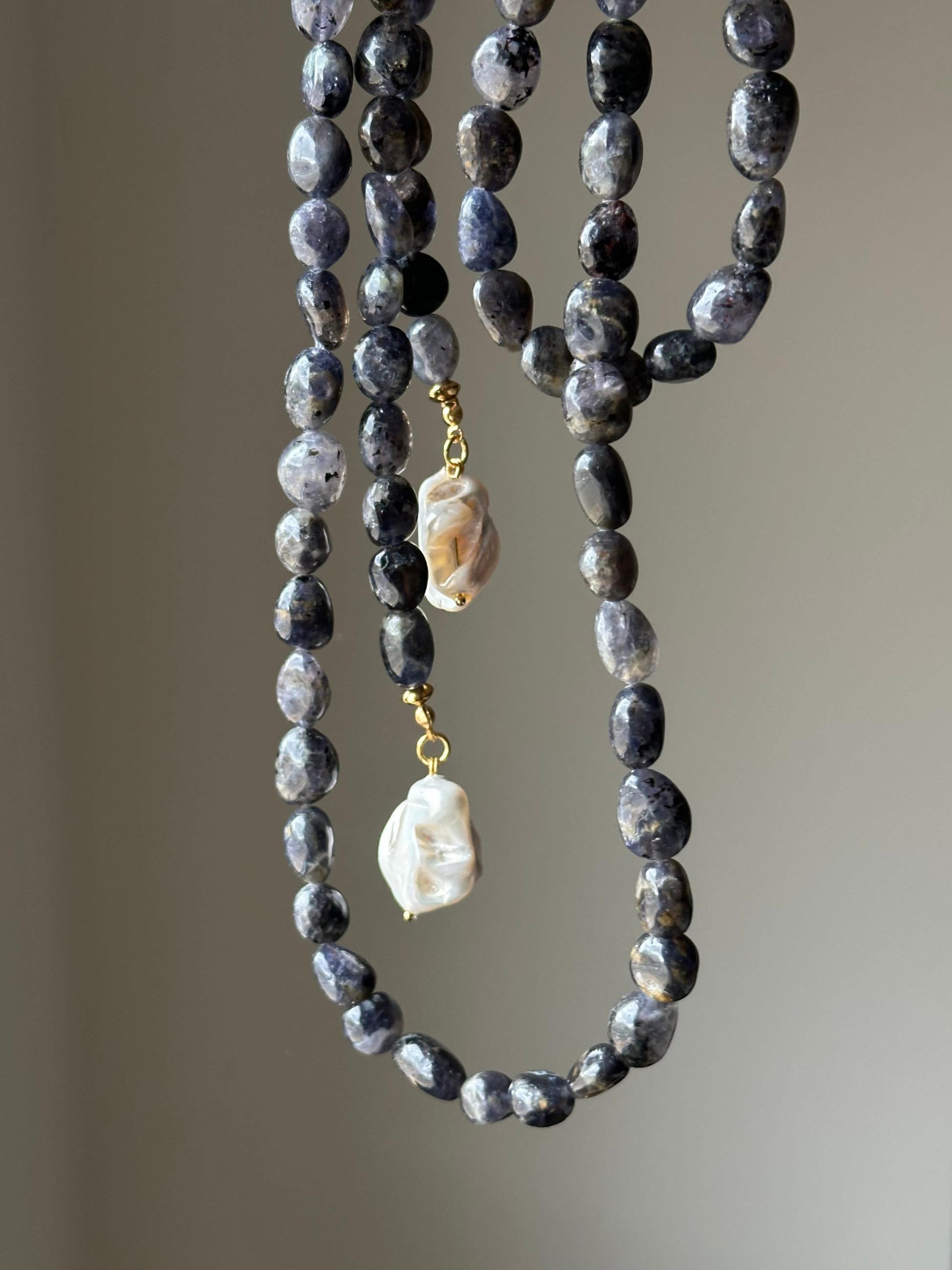 Piedras iolita grisáceas/azules conforman este precioso collar de 120cm con terminación en perlas de río irregulares blancas.