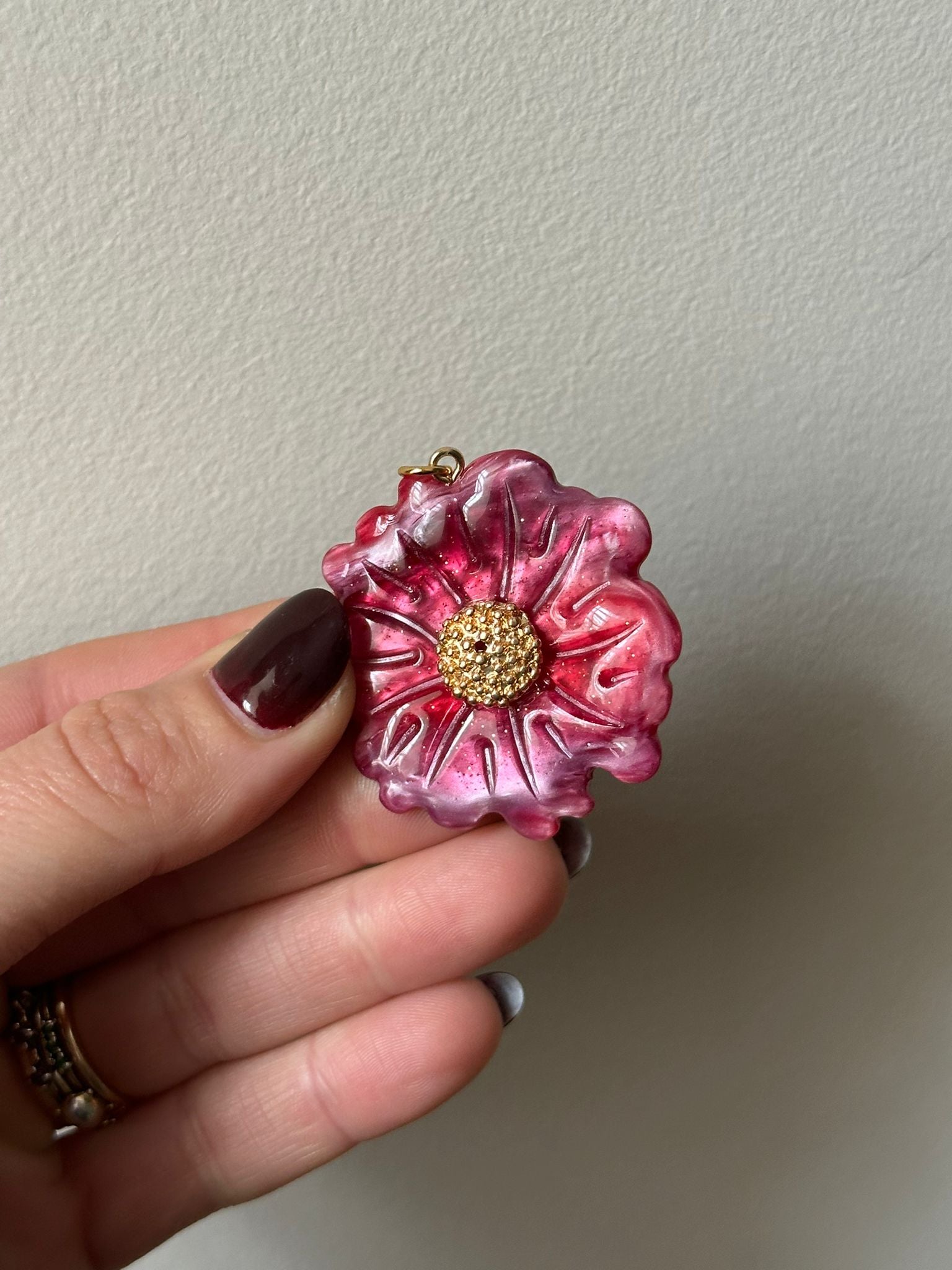 Charm de acrílico en tono rosa/granate perfecto para decorar los modelos Lourdes.