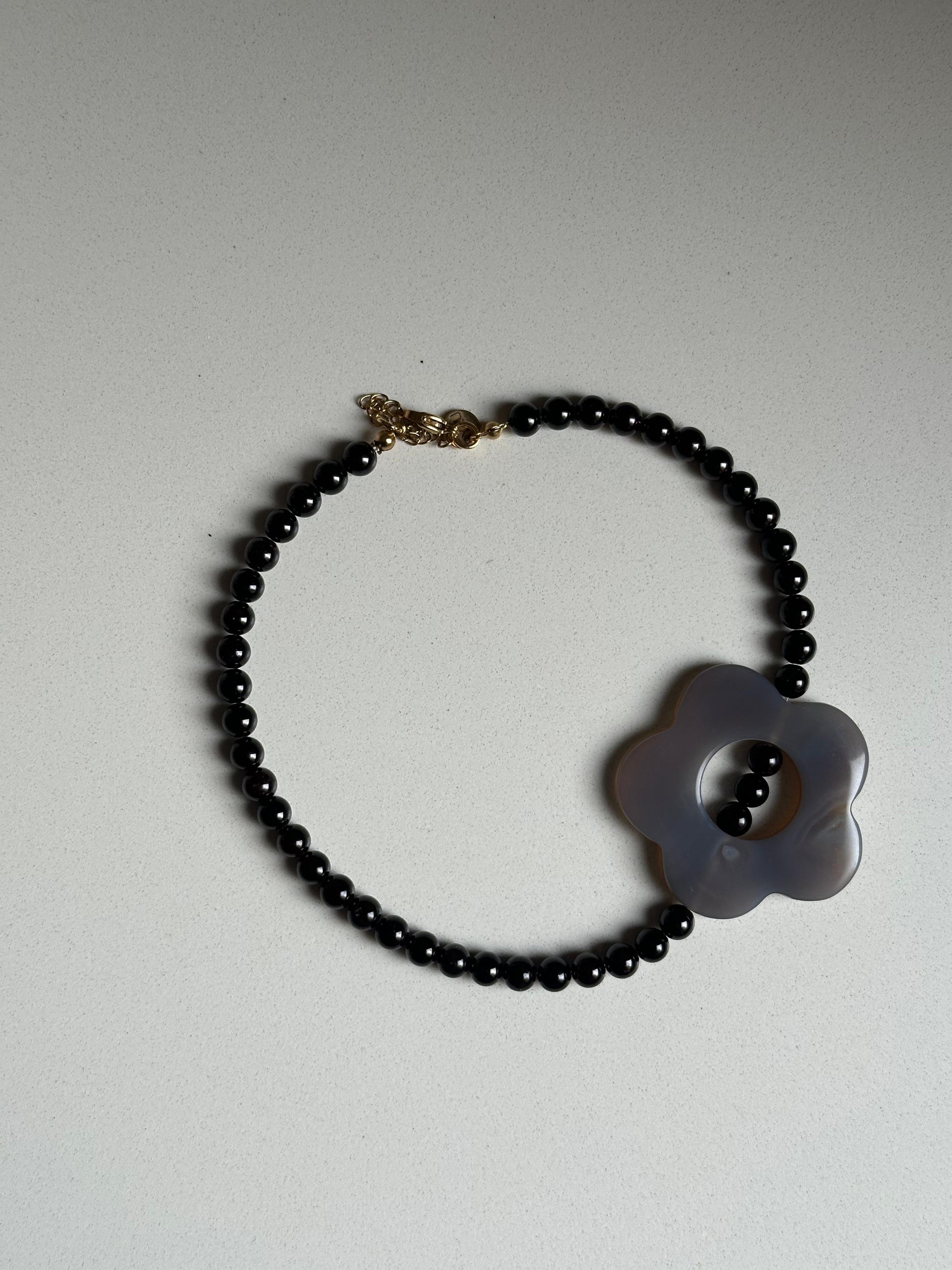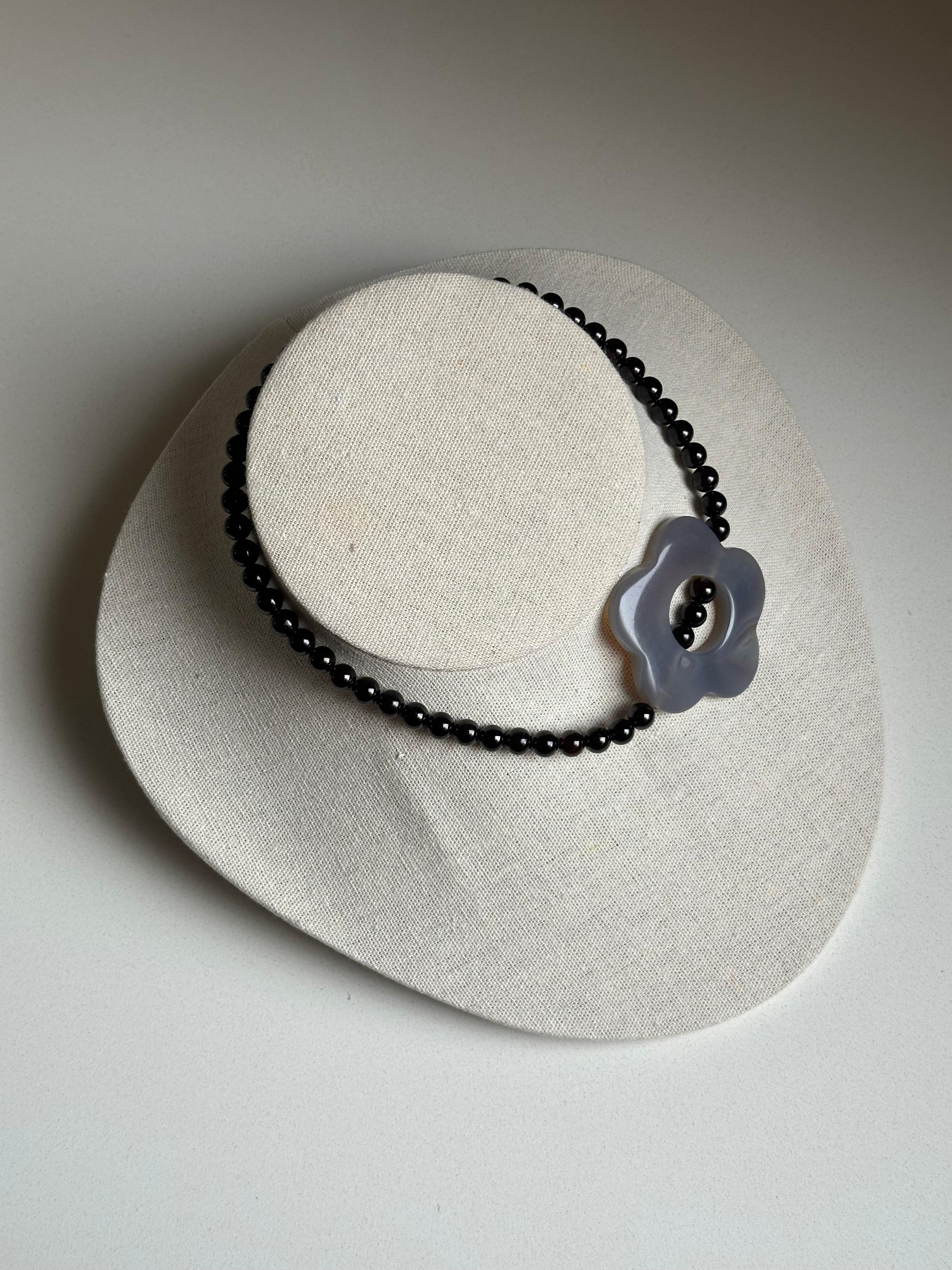 Chocker gris con el detalle de la flor en el lateral. Todo el collar está formado de mineral granate (bastante oscuro).