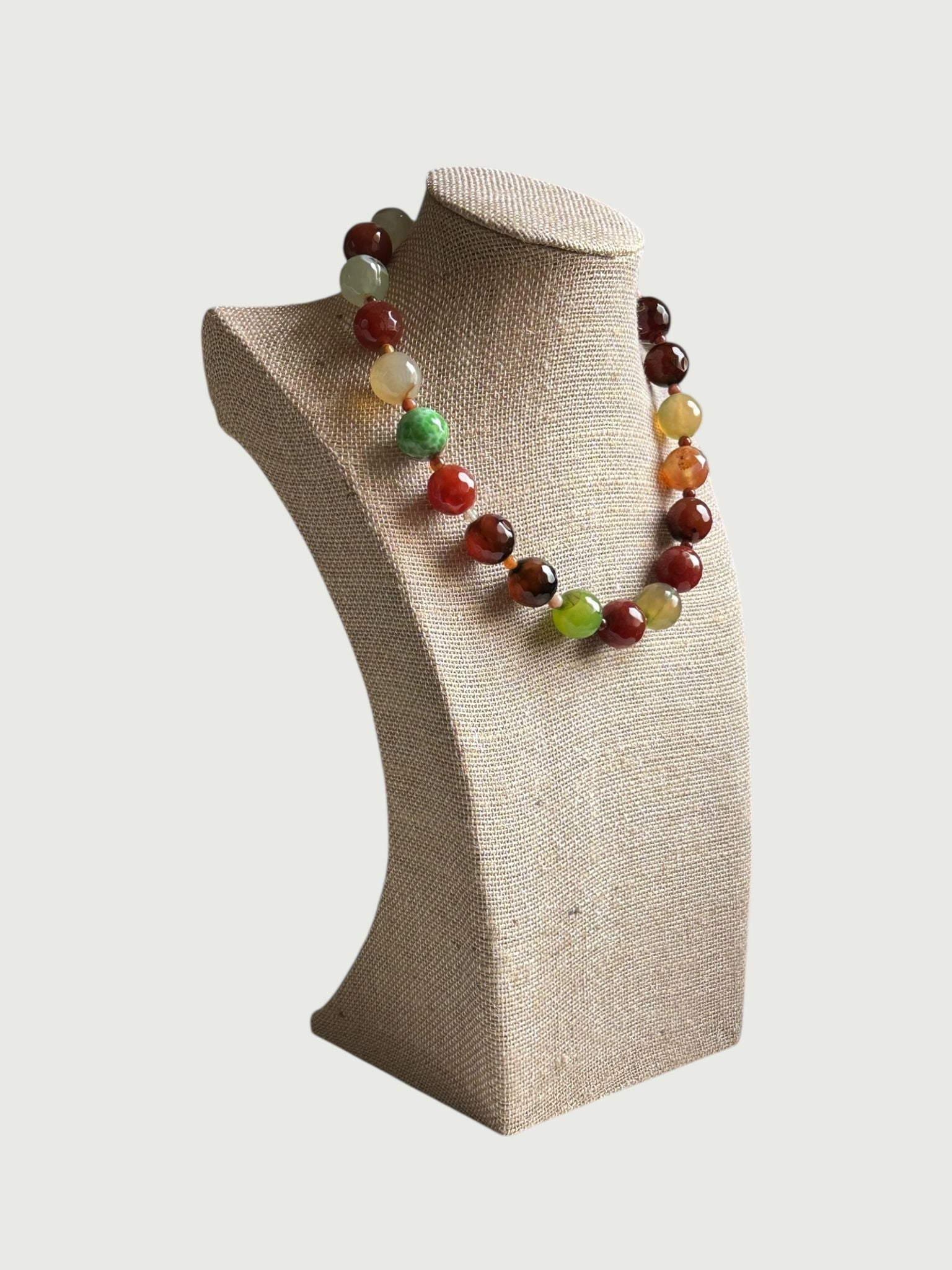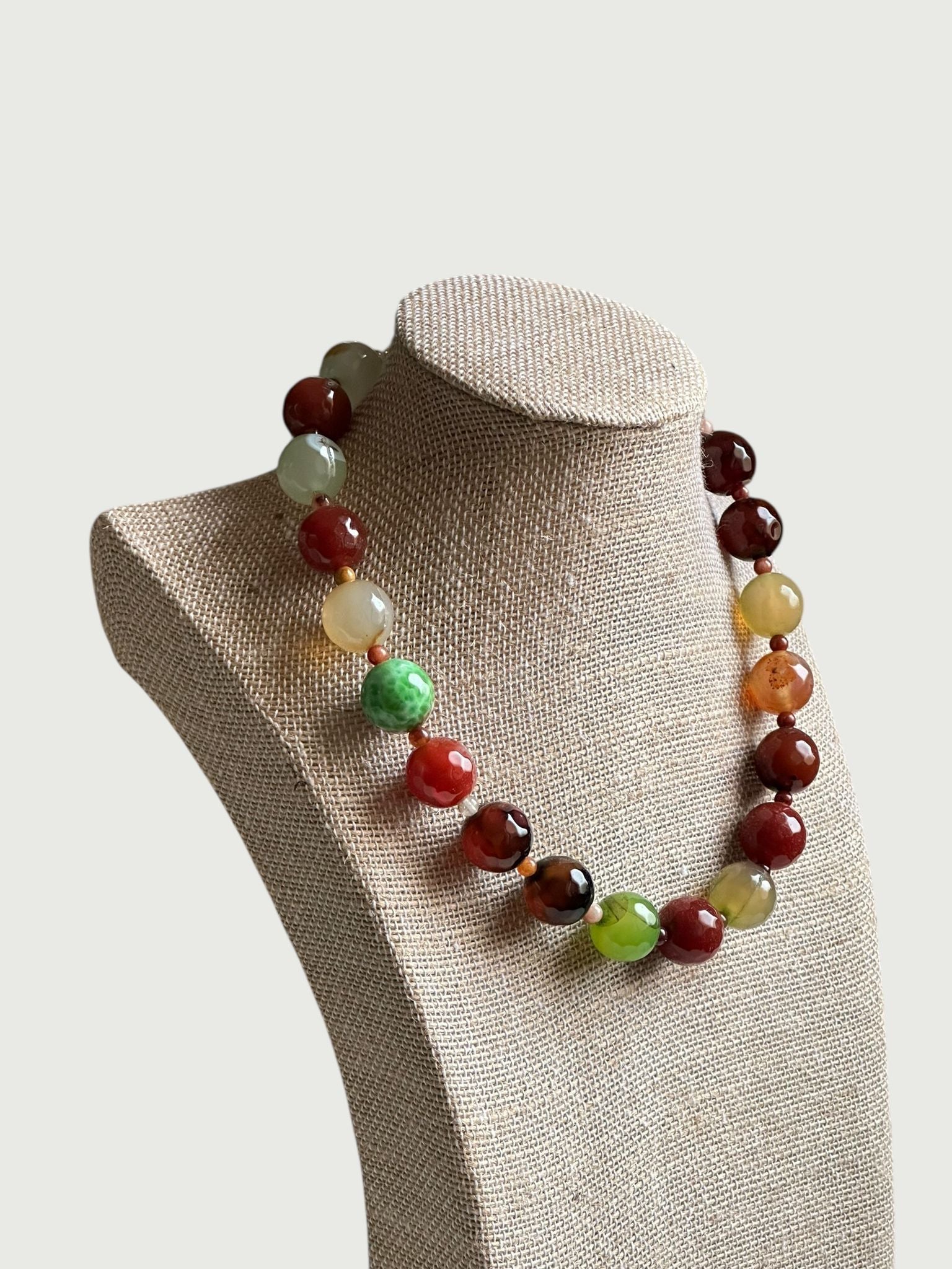 Collar de piedras de ágata en forma esférica. Tiene tonos marrones, verdes y beige.