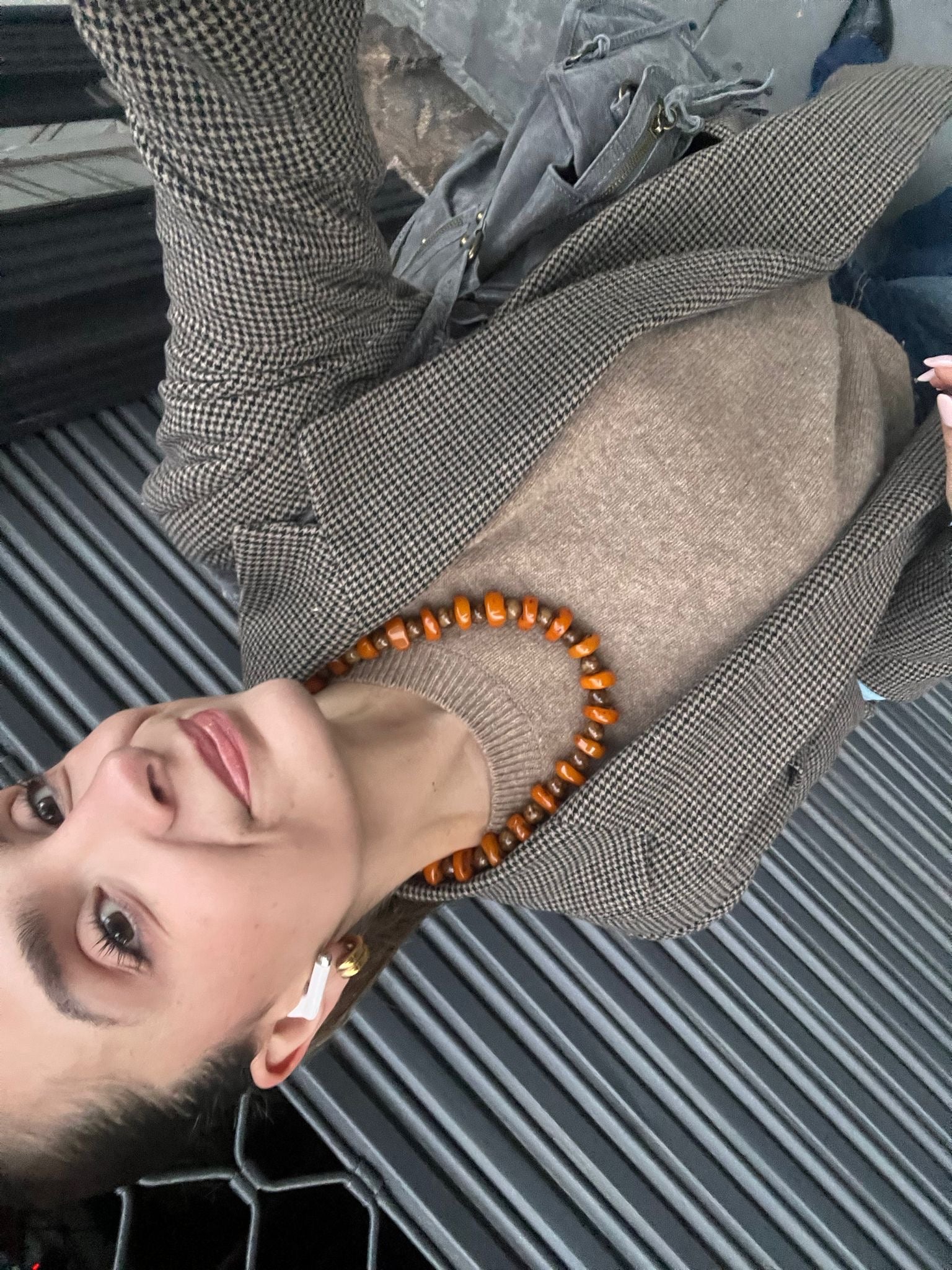 Collar de piezas de acrílico en tonos naranjas con piedras naturales de ojo de tigre entre ellas